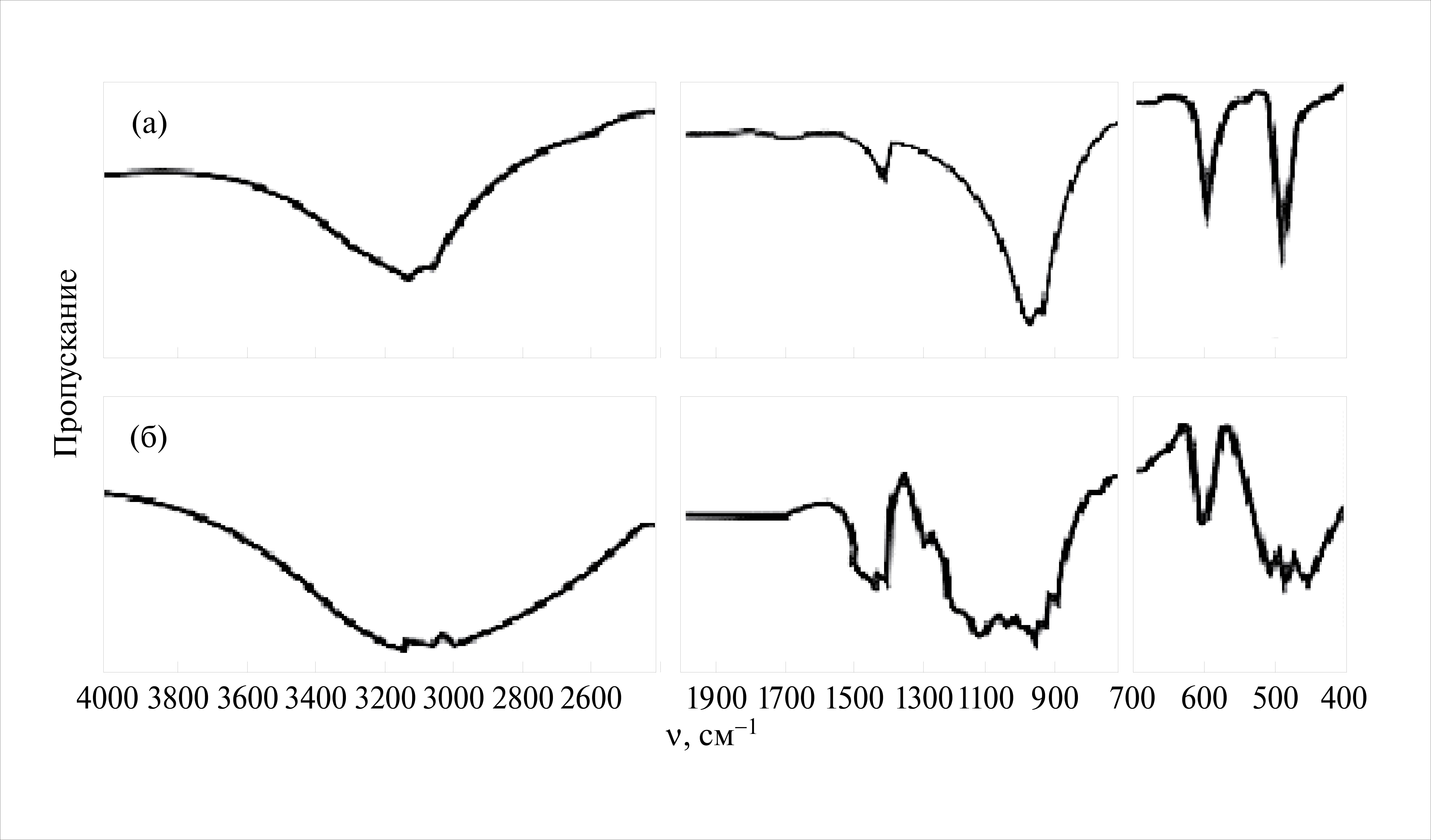Рис. 2. ИК-спектры: а — NH4ClO3, б — NH4ClO3 ∙ ClCH2CH2HPO3NH4.