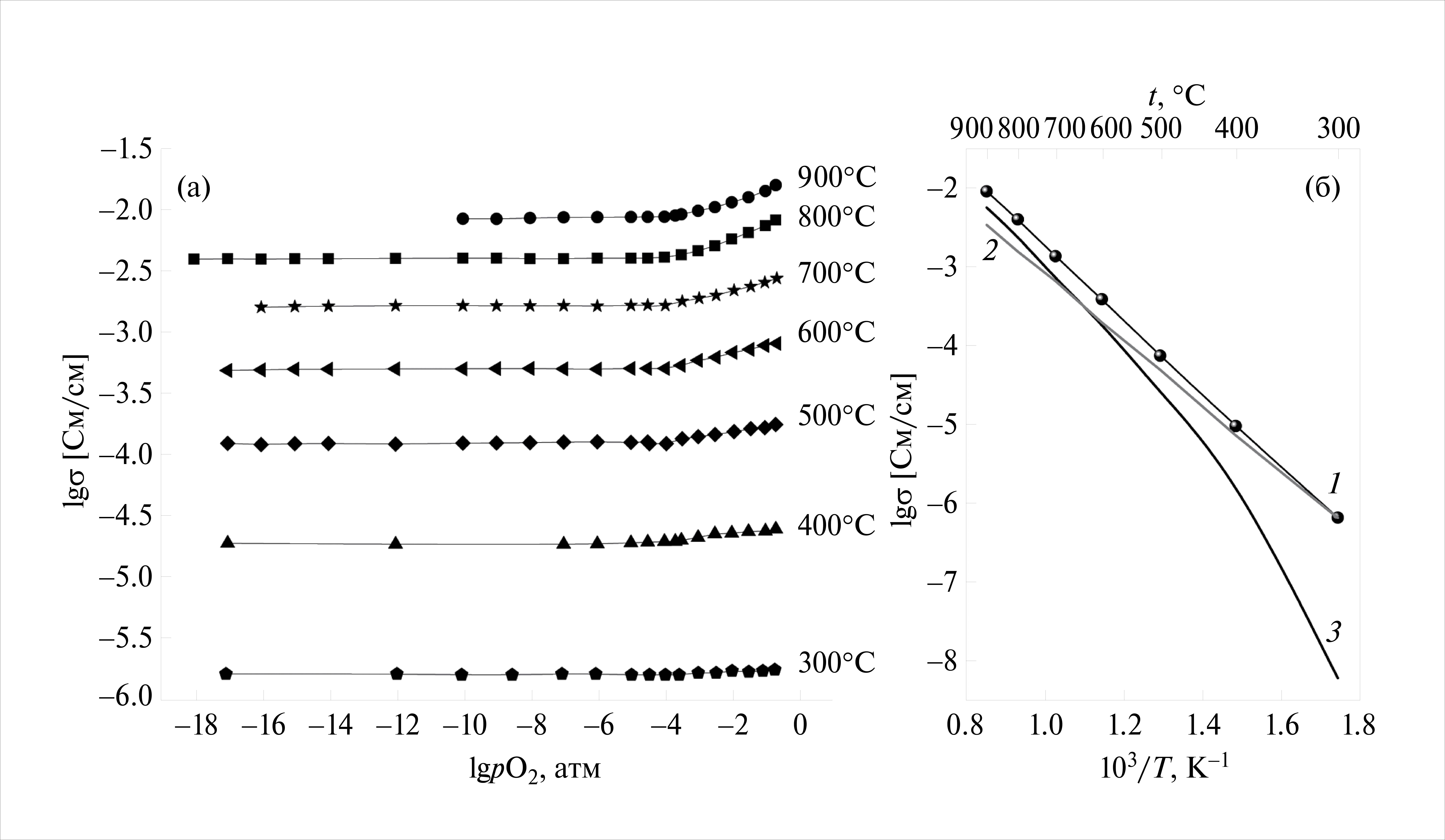 Электропроводность была аттестована двухконтактным методом на переменном токе в интервале частот 1–106 Гц с использованием измерителя-анализатора Z-1000P (Elins). Обработку полученных данных и расчет сопротивления образцов проводили с использованием программы Zview. Электрические измерения проводили при варьировании температуры (t = 300–900°С) и парциального давления кислорода (рО2 = 0.21–10–16 атм). Парциальное давление кислорода задавали и контролировали с использованием электрохимических насоса и датчика, изготовленных из стабилизированного оксида циркония ZrO2 (10 мол. % Y2O3). В ходе эксперимента в измерительной ячейке поддерживали низкое парциальное давление паров воды (рН2О = 3 × 10–5 атм) путем циркуляции воздуха, предварительно очищенного от СО2, через осушающий реагент — порошок Р2О5.