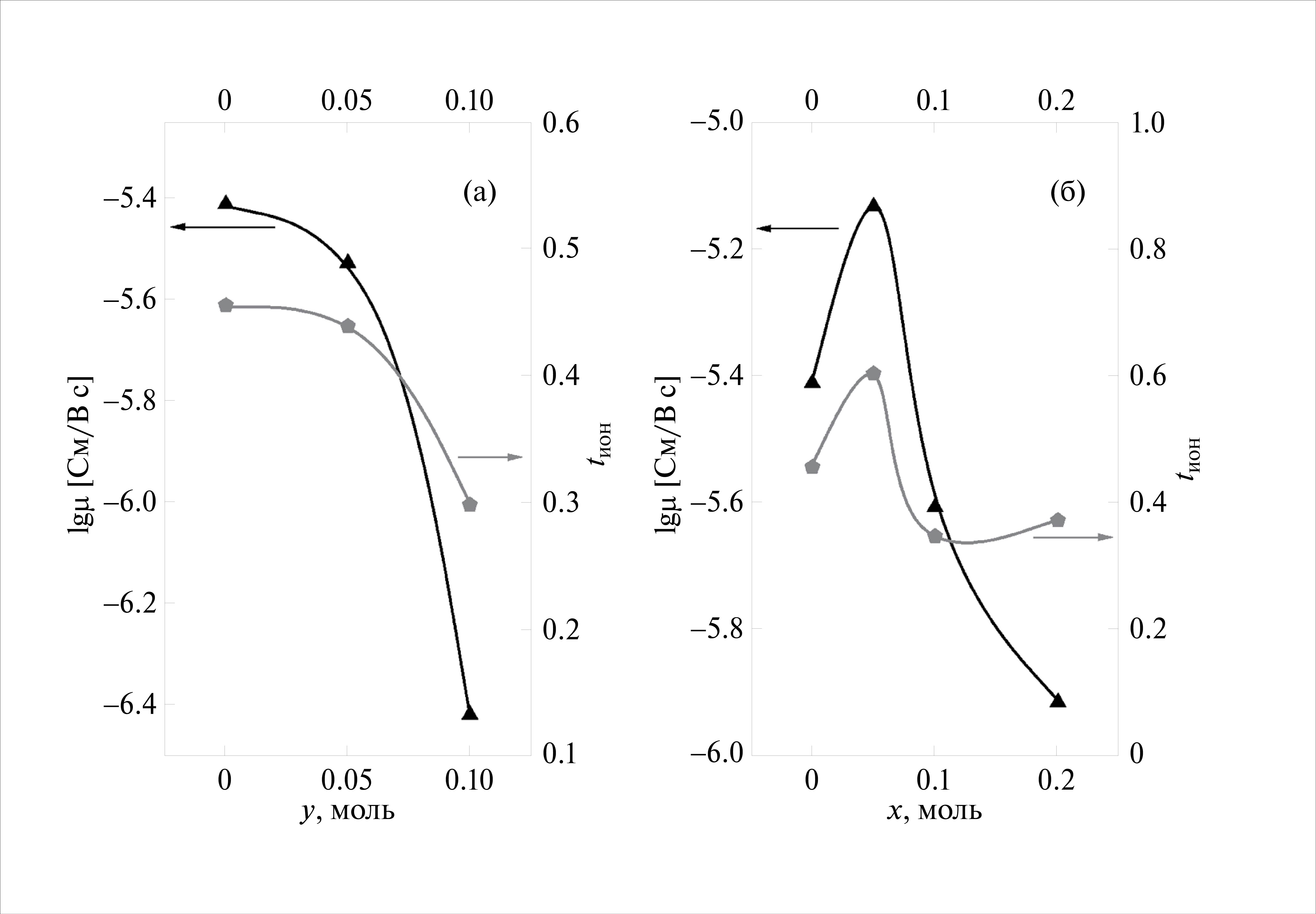 Рис. 9. Концентрационные зависимости подвижности кислорода и ионных чисел переноса для твердых растворов La0.9Sr0.1In1–yMgyO2.95–0.5y (а) и La0.9Sr0.1In1–xCaxO2.95–0.5x (б) при температуре 700°С.