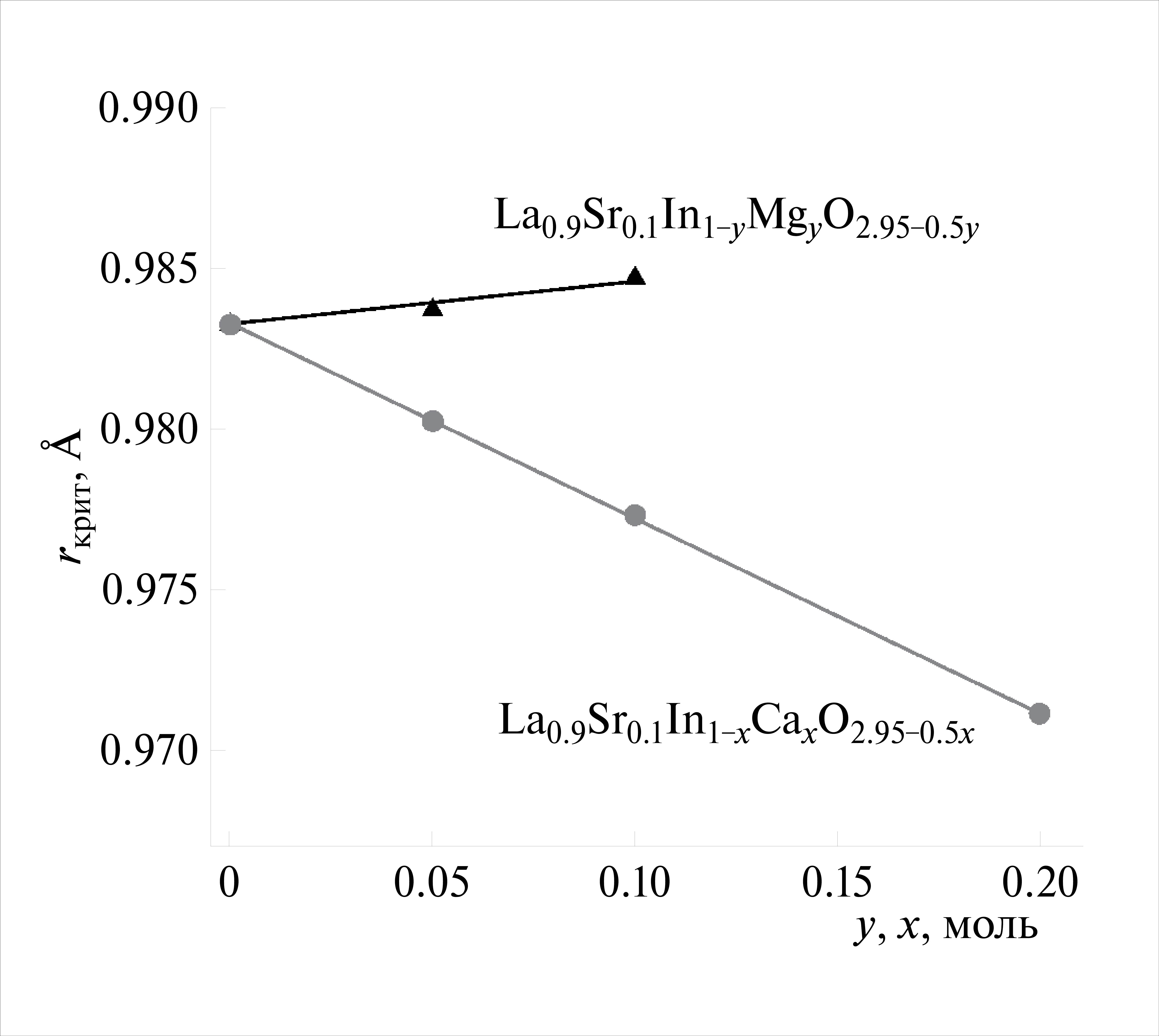 Если рассмотреть изменение критического радиуса для магний-замещенных твердых растворов, можно отметить очень небольшое увеличение данного параметра при росте содержания ионов магния, так как на место индия вводится меньший ион магния — 0.80 и 0.72 Å [20]. Но как упоминалось ранее, появление более прочных связей Мg–O является преобладающим фактором, влияющим на ионную проводимость. Это подтверждают и более высокие значения энергии активации кислородной проводимости Mg2+-замещенных образцов, по сравнению с Са2+-допированными фазами.
