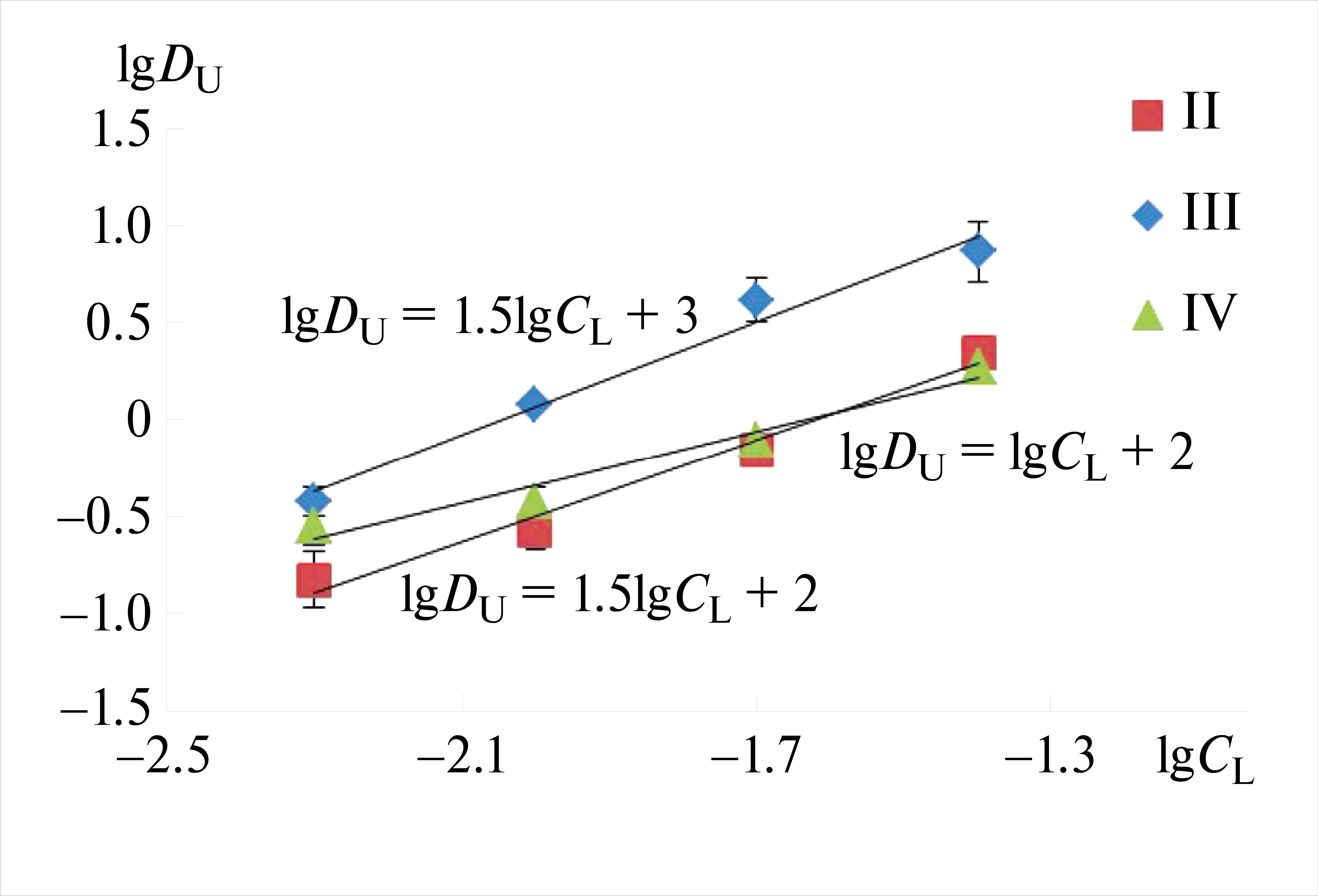 Рис. 2. Логарифмические зависимости коэффициентов распределения U(VI) от концентрации лиганда CL при экстракции соединениями II, III и IV из 1 моль/л HNO3 в CHCl3 (исходная концентрация нитрата уранила в водной фазе 0.025 ммоль/л).