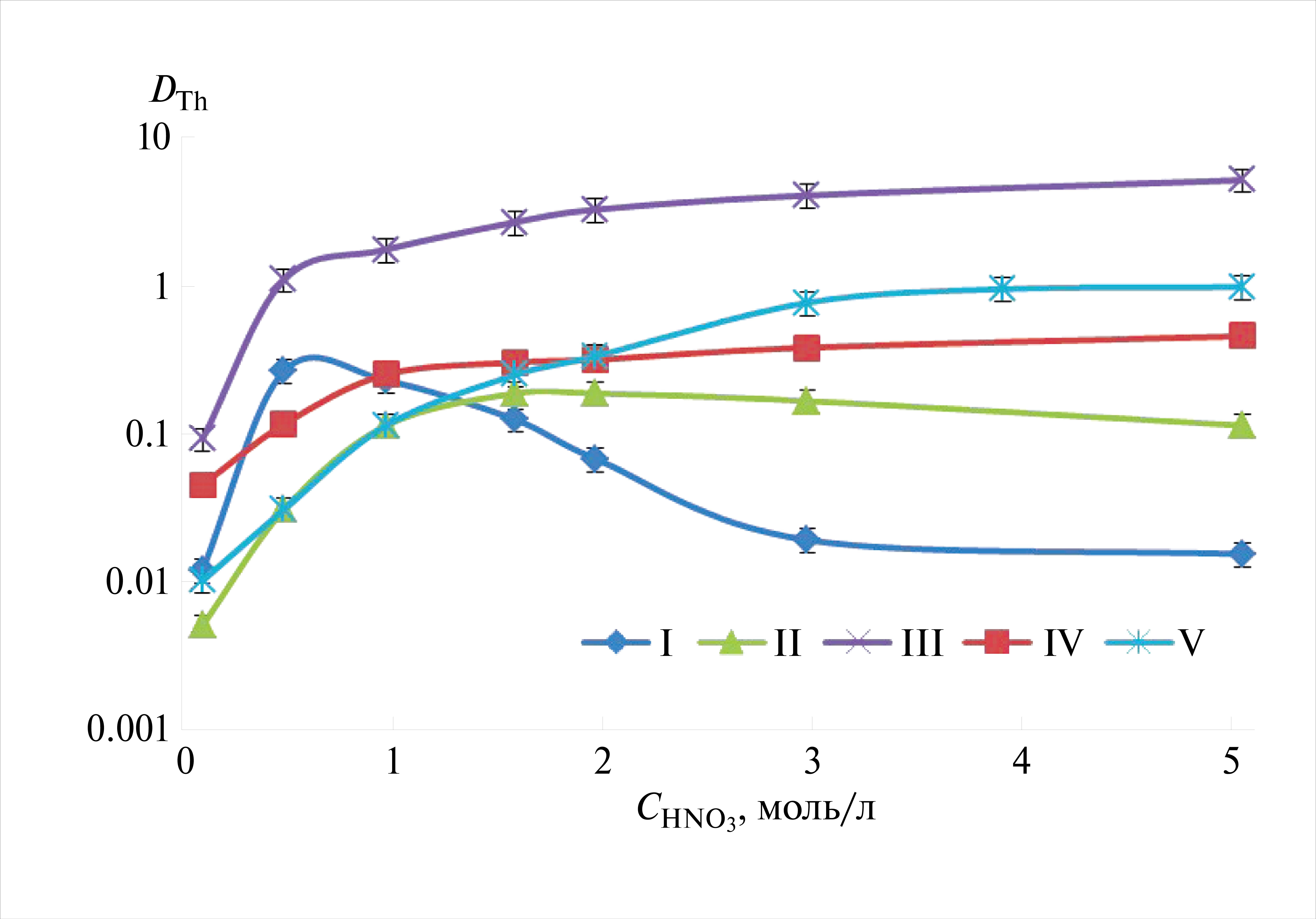 Зависимость коэффициентов распределения (DTh) от концентрации азотной кислоты аналогична описанной выше для экстракции нитрата уранила и носит симбатный характер для всех исследованных лигандов, кроме соединения I, в случае которого наблюдается максимум DTh при концентрации HNO3 0.5 моль/л (рис. 3). Подобный характер зависимости типичен для случая монодентатной координации металла с лигандом [13, 14, 31]. Как и в случае с U(VI), коэффициенты распределения Th(IV) увеличиваются в ряду I < II < IV < V < III, но зависимость DTh от структуры лиганда имеет более ярко выраженный характер. Так, степень извлечения Th(IV) в одну стадию для соединений I и II ниже, чем для U(VI), и составляет < 10% при концентрации HNO3 > 0.5 моль/л. Для соединений IV и V степень извлечения в тех же условиях эксперимента близка к таковой при экстракции U(VI), а для соединения III, вновь продемонстрировавшего наибольшую эффективность экстракции, степень извлечения достигает ~ 85%, что, напротив, несколько выше, по сравнению с U(VI). Рассматривая влияние строения лиганда на эффективность экстракции, можно отметить, что, как и в случае с U(VI), наличие в молекуле дифенилфосфорилированных КЭФО дополнительных карбонильных групп мало влияет на эффективность комплексообразования и экстракции, а интегральную эффективность экстракции определяет количество фрагментов Ph2P(O)CH2CH2C(O), их взаимное расположение и конформационная жесткость линкера. Можно обоснованно предположить, что эта тенденция будет общей для шести- и четырехвалентных актинидов.