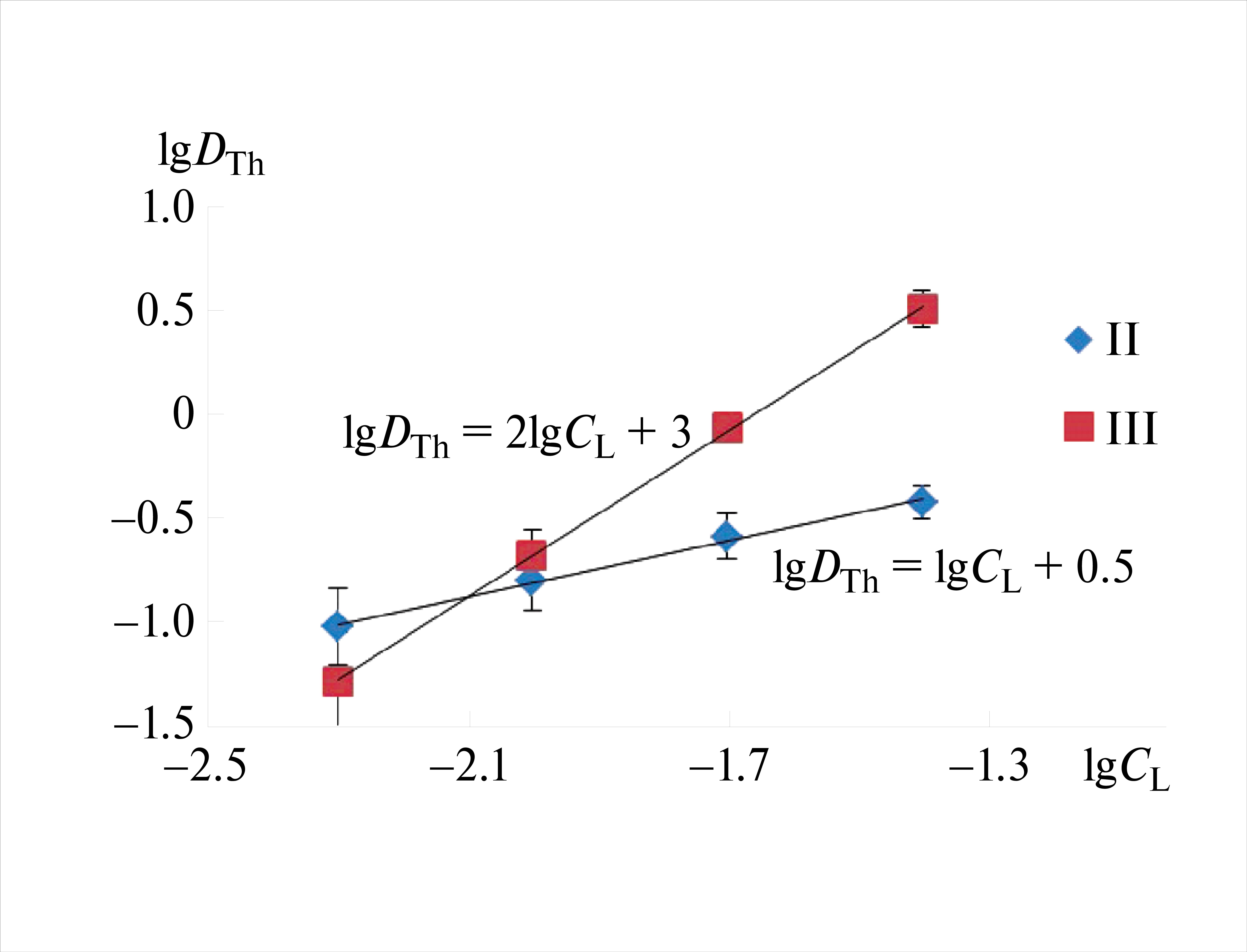 Рис. 4. Логарифмические зависимости коэффициентов распределения Th(VI) от концентрации лиганда CL при экстракции соединениями II и III из 1 моль/л HNO3 в CHCl3 (исходная концентрация нитрата тория в водной фазе 0.025 ммоль/л).