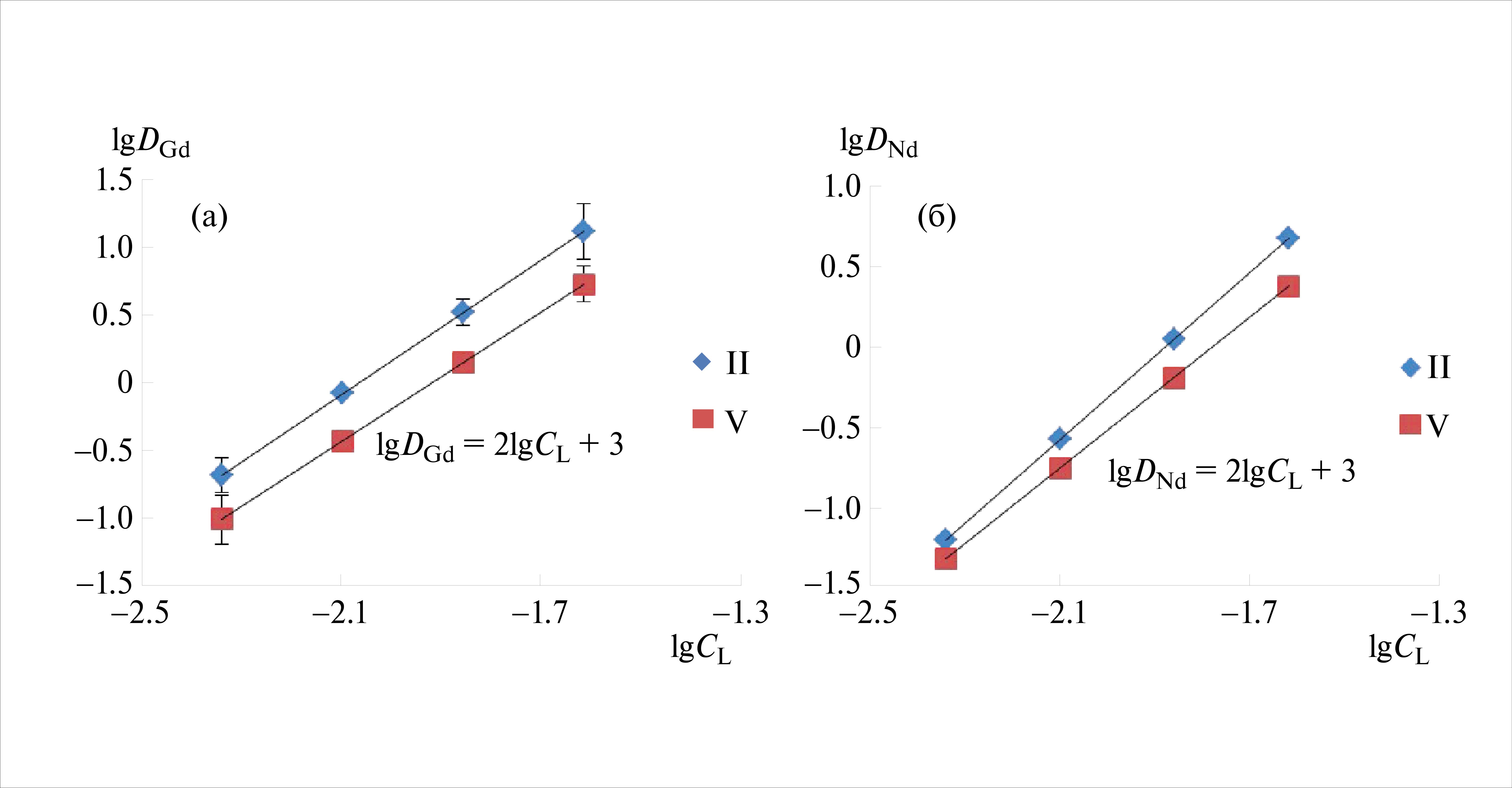 Методом сдвига экстракционного равновесия при изменении концентрации экстрагентов II и V установлены составы комплексных соединений с Gd(III) и Nd(III) в растворе 1 моль/л HNO3. Для этих КЭФО характерно образование биc-лигандных комплексов: угловой коэффициент линейной зависимости в билогарифмических координатах на рис. 6а и 6б близок к 2. Образование такого рода комплексов вполне согласуется с результатами ранее выполненных исследований комплексообразования лантанидов с родственными бидентатными функционализированными фосфиноксидами R2P(O)CH2C(O)R′ [36] и R2P(O)CH2C(O)NR2′ [3, 37, 38], а также с фосфорилмочевинами R2P(O)NHC(O)NHR′ [39], где было показано, что лантаниды экстрагируются в виде катионных и нейтральных комплексов [Ln(L)n(NO3)2]+(NO3)– и [Ln(L)n(NO3)3]0 при n = 2. При этом в области малых концентраций HNO3 лантаниды экстрагируются преимущественно в виде нейтральных комплексов состава [Ln(L)n(NO3)3]0, а с увеличением концентрации кислоты растет содержание комплексов состава [Ln(L)n(NO3)2]+(NO3)–, соответственно, возрастают и коэффициенты распределения при экстракции лантанидов [13], что также вполне согласуется с полученными экспериментальными данными.