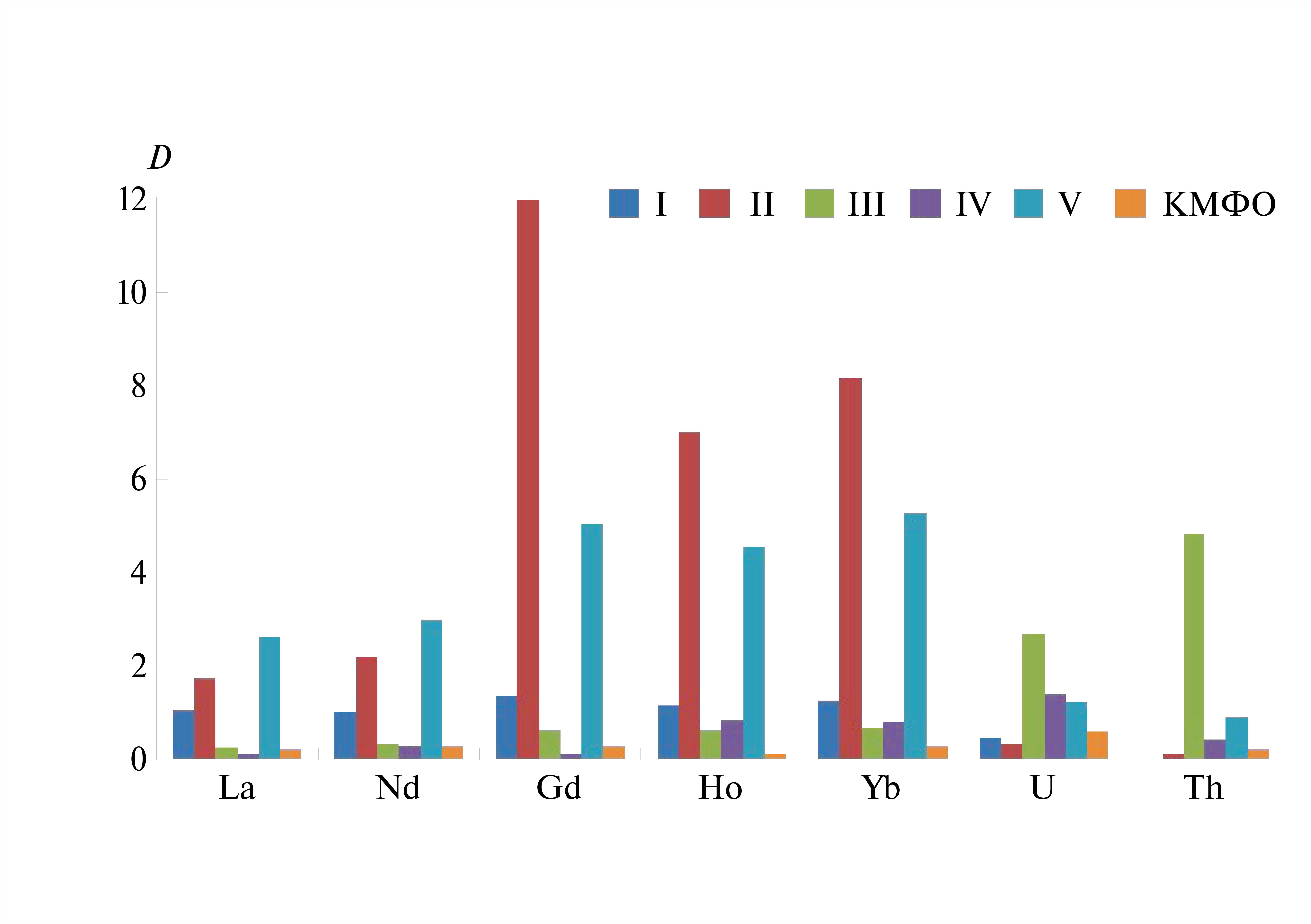 Рис. 7. Коэффициенты распределения f-элементов при экстракции 0.01 моль/л растворами КЭФО I–V и КМФО в хлороформе из 5 моль/л HNO3.