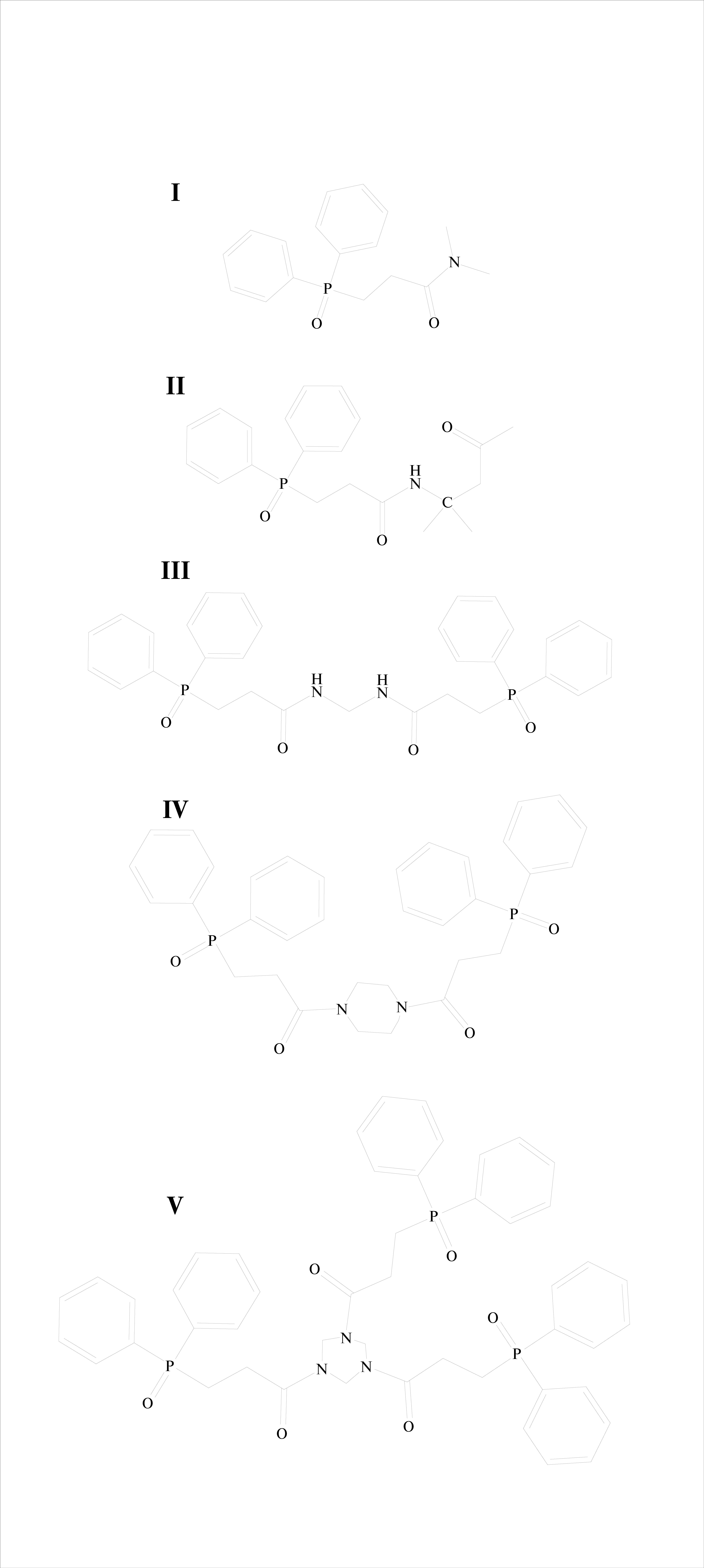 Все эти реакции протекают при комнатной температуре и позволяют получать с достаточно высоким выходом (~60–80%) как потенциально бидентатные Р,Р-дифенилфосфорилированные КЭФО, так и более сложные олигодентатные структуры, в том числе содержащие несколько лигандирующих фрагментов Ph2P(O)CH2CH2C(O)N<. Строение синтезированных соединений было подтверждено методом ЯМР-спектроскопии (1Н, 13С{1H}, 31P{1H}), а амидов I, III, IV – кроме того, при помощи РСА: депозиты CCDC 2268302–2268304 соответственно.