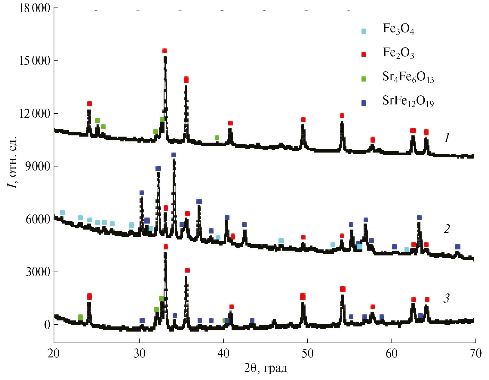 Рис. 1. Рентгеновские дифрактограммы образцов валового состава SrFe12O19 (термическая обработка при 650°С в течение 48 ч), полученных из нитрат-органических прекурсоров следующего состава (φ = 1): 1 — ПВП; 2 — ПВС; 3 — глицин.