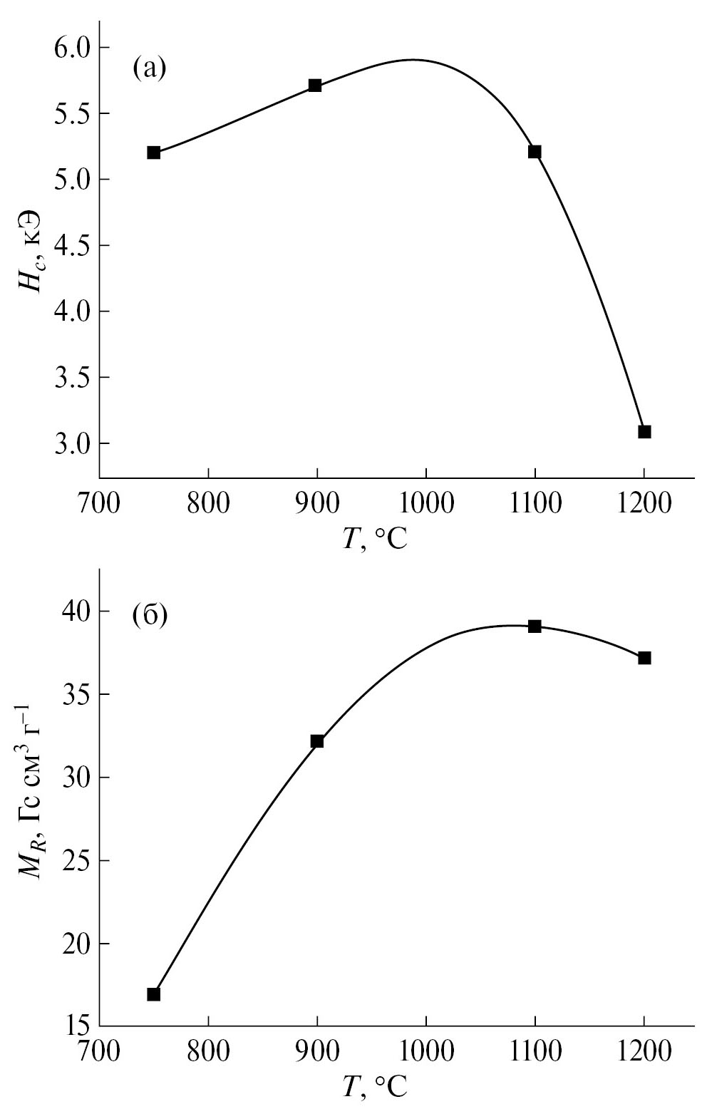 3. Fig. 2. Values of the coercive force Hc (a) and the residual specific magnetization MR (b) for SrFe12O19 samples at different annealing temperatures.
