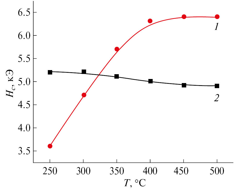 Рис. 4. Коэрцитивная сила образцов, синтезированных при разном количестве ПВС (φ = 1 — кривая 1; φ = 2 — кривая 2).
