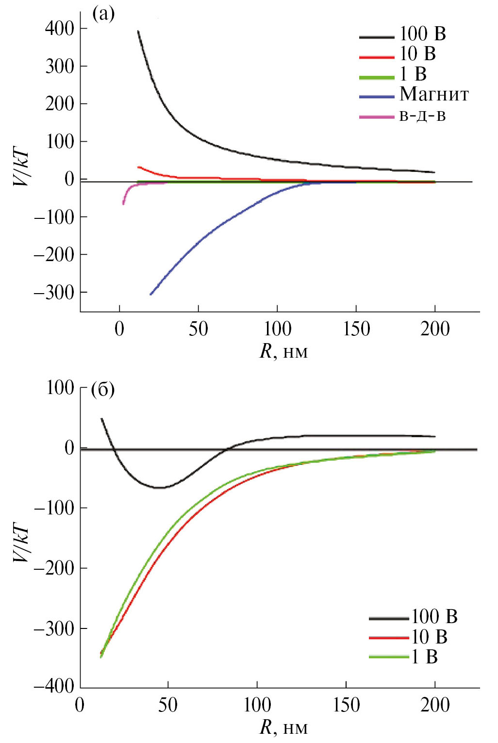 Рис. 6. Потенциалы взаимодействия наночастиц (а), кривые сверху вниз: электростатическое отталкивание при зарядах на прекурсоре, эквивалентных 1, 10, 100 В соответственно; магнитное взаимодействие, ван-дерваальсовы силы; результирующие кривые для этих же значений зарядов (б): сверху вниз — 100, 10 и 1 В.