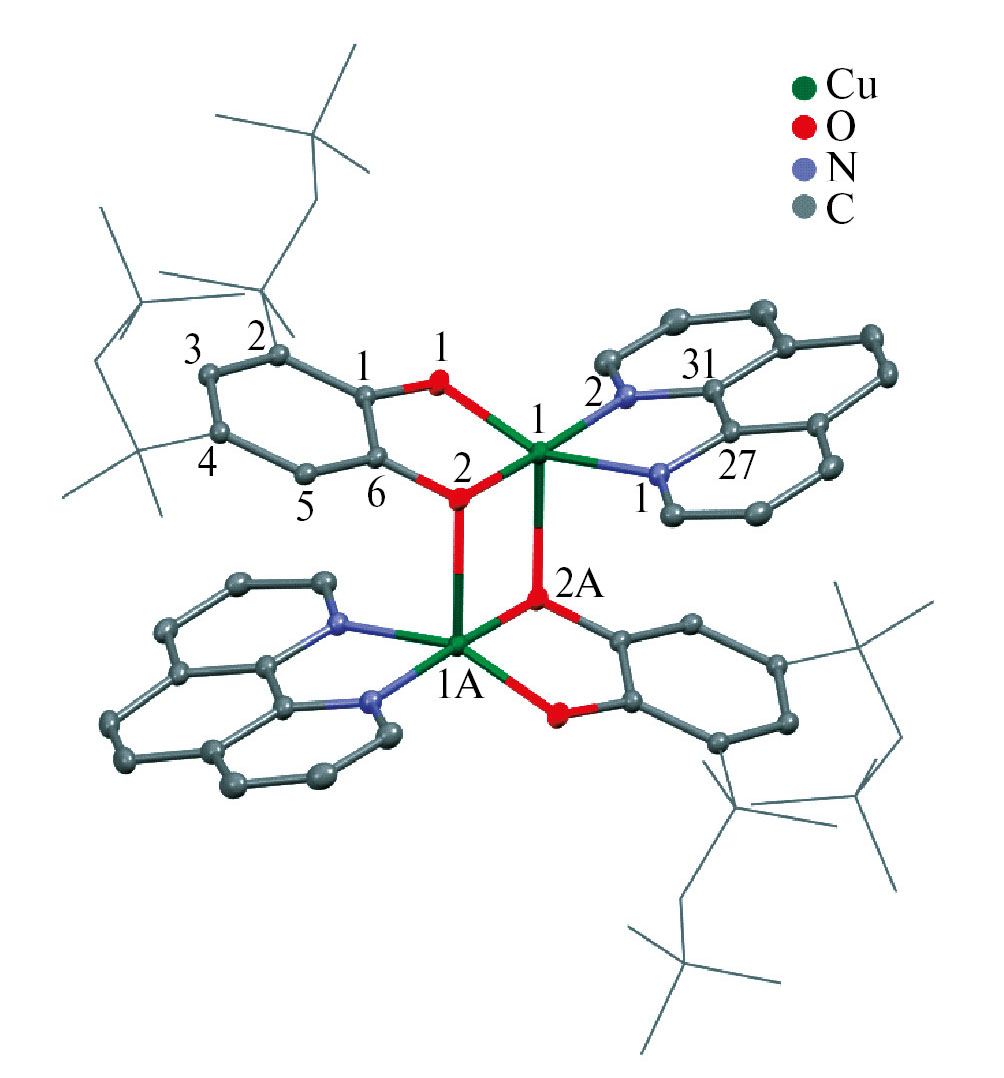 Молекулярное и кристаллическое строение соединения II определено методом рентгеноструктурного анализа (рис. 2). Комплекс II является димером и кристаллизуется в триклинной группе симметрии P1. Координационное окружение каждого иона меди(II) в димере представляет собой тетрагональную пирамиду, в основании которой лежат атомы кислорода катехолатного лиганда и атомы азота фенантролина, а в вершине находится атом кислорода катехолатного лиганда соседнего комплекса. Таким образом, в производном II дианион о-бензохинона (3,5-t-Oc-Cat-2–) выступает в качестве мостикового лиганда с типом координации μ2-ê1:ê2. Координация кислорода катехолата соседней молекулы комплекса на ион меди приводит к “вытягиванию” Cu(1) из плоскости O(1)O(2)N(1)N(2) на 0.246 Å, а сумма углов, образованных связями вокруг атома меди, составляет 358.04°, что близко по значению к идеальному плоскоквадратному основанию (360°). Диэдральный угол между плоскостями O(1)C(1)C(6)O(2) и N(1)C(27)C(31)N(2) составляет 32.90°.