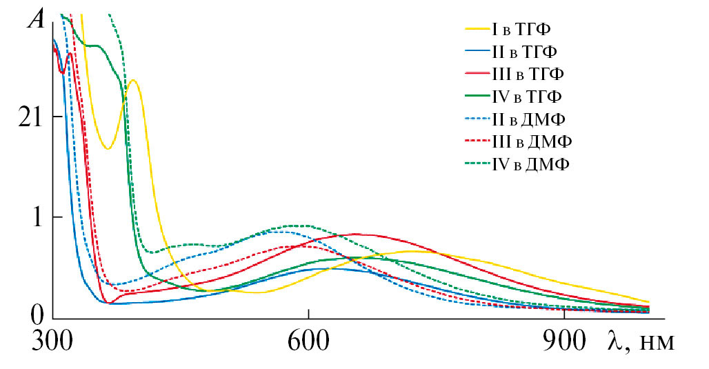 Электронные спектры поглощения соединений I–IV получены для растворов производных в ТГФ и ДМФ, за исключением раствора I в ДМФ (рис. 4). Данные спектры характеризуются наличием широкой полосы переноса заряда в видимой и ближней ИК-областях спектра (450–800 нм).