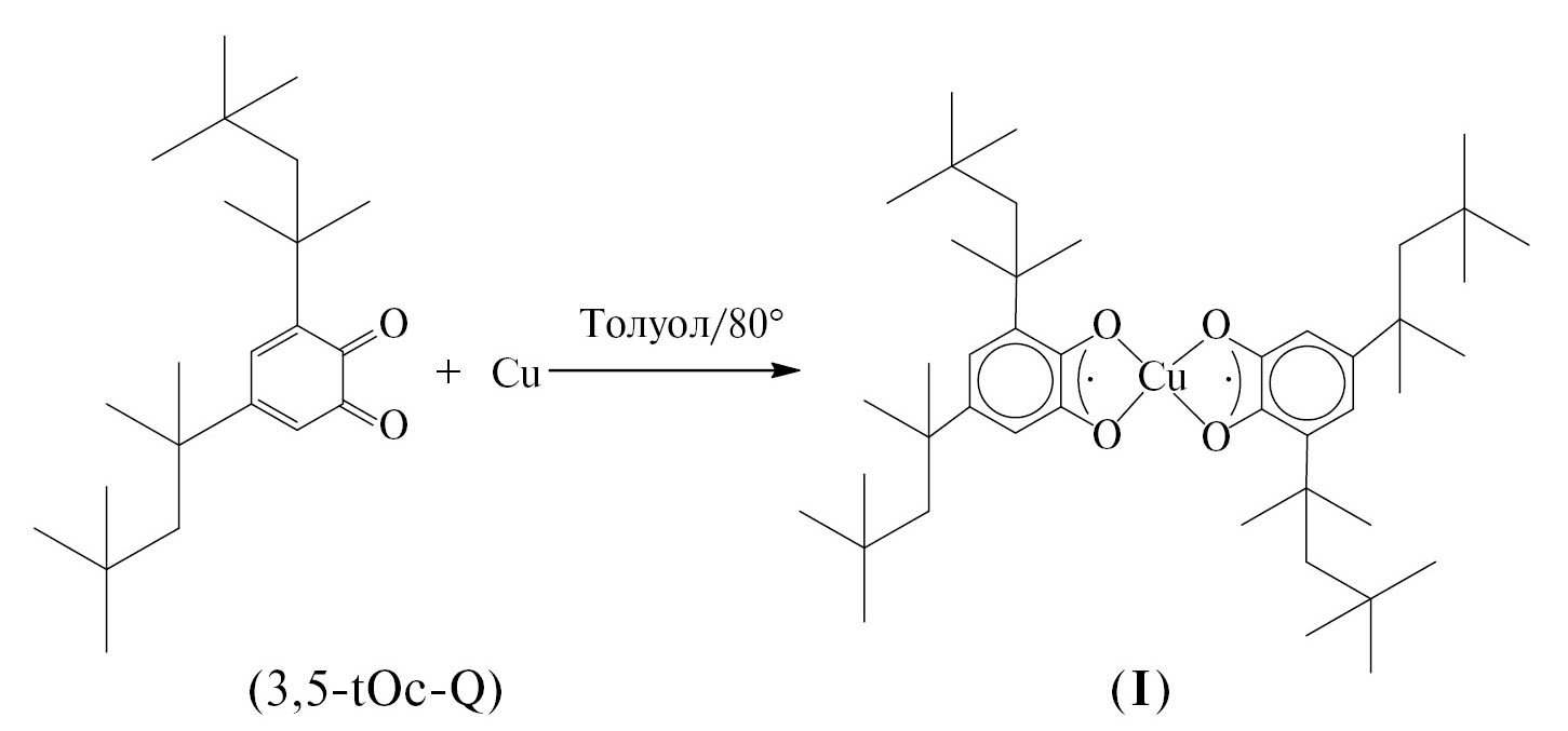 Синтез бис-семихинолята меди(II) (3,5-t-Oc-SQ)2Cu (I) на основе нового стерически загруженного лиганда осуществлен в реакции восстановления 3,5-ди-трет-октил-о-бензохинона металлической медью в толуоле при 80°С в течение 8 ч (схема 1). Реакция протекает в анаэробных условиях в течение суток, в результате происходит изменение цвета реакционной смеси с зеленого на темно-синий. При охлаждении полученного раствора I до комнатной температуры наблюдается выпадение кристаллического продукта. Строение синтезированного гомолептического бис-лигандного комплекса меди установлено методами рентгеновской дифракции на монокристаллах, а также подтверждено данными ИК-спектроскопии и элементного анализа.