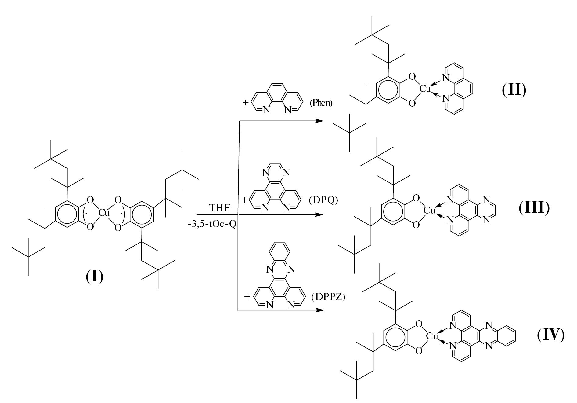 Взаимодействие (3,5-t-Oc-SQ)2Cu с нейтральными N-донорными лигандами фенантролинового типа проводили в анаэробных условиях в среде TГФ. В результате протекания данной реакции происходит вытеснение одной молекулы хинона (3,5-t-Oc-Q) из координационной сферы меди и образование металлокомплексов состава (3,5-t-Oc-Cat-)Cu(Phen) (II), (3,5-t-Oc-Cat-)Cu(DPQ) (III) и (3,5-t-Oc-Cat-)Cu(DPPZ) (IV) (схема 2). Производные II–IV выделены из реакционной смеси в виде мелких синих игольчатых кристаллов. Cоставы комплексов II–IV подтверждены данными ИК-спектроскопии и элементного анализа. Катехолаты меди(II) с фенантролиновыми лигандами в координационной сфере металла парамагнитны и плохо растворяются в большинстве органических растворителей. Спектры ЭПР для кристаллических образцов представляют собой широкий синглет с gi = 2.079, 2.077 и 2.071 для комплексов II, III и IV соответственно. Данные значения хорошо согласуются с конфигурацией d 9 иона двухвалентной меди [64] (схема 2).
