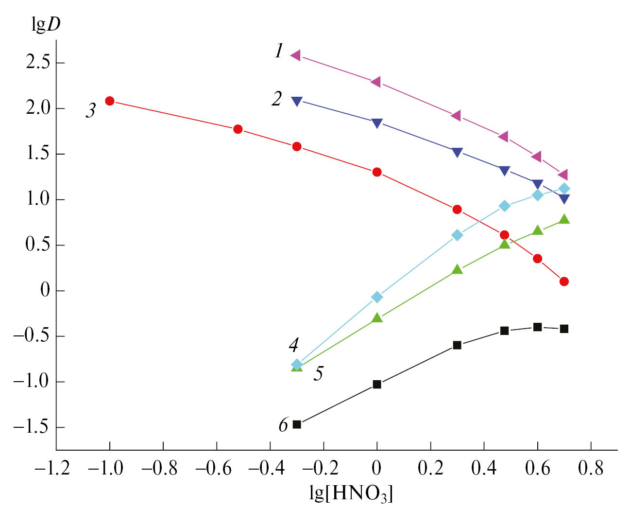 Рассмотрено влияние концентрации HNO3 в равновесной водной фазе на экстракцию ионов U(VI), Th(IV) и Ln(III) растворами соединения L в ДХЭ, содержащем 0.002 M [ImP][Tf2N]2. Для сравнения на рис. 1 приведены данные по экстракции этих ионов растворами соединения L в ДХЭ без ИЖ. Увеличение концентрации HNO3 в водной фазе сопровождается ростом коэффициентов распределения Ln(III) при использовании раствора L в ДХЭ без ИЖ. При [HNO3] > 3 моль/л рост DU, DTh и DEu несколько замедляется (рис. 1), что связано с заметной соэкстракцией HNO3 [24]. Такой характер зависимости lgD–lg[HNO3] наблюдался при экстракции U(VI), Th(IV) и Ln(III) растворами КМФО в молекулярных растворителях по сольватному механизму в виде координационно-сольватированных нитратов [30].