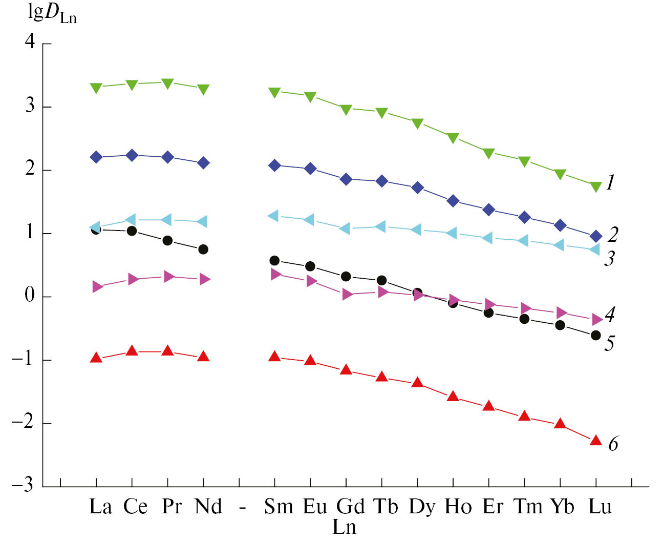 При постоянной концентрации HNO3 (0.3 М) изучали влияние концентрации ионов NO3– в водной фазе на экстракцию Ln(III) смесями L и [ImP][Tf2N]2 в ДХЭ. Изменение концентрации NH4NO3 от 0.5 до 4 моль/л не приводит к заметному изменению величины DLn. Следовательно, ионы NO3– не принимают участия в образовании экстрагируемых комплексов в системе L–[ImP][Tf2N]2–ДХЭ в этих условиях. Следует отметить, что ионы Ln(III) эффективно экстрагируются смесями L и [ImP][Tf2N]2 в ДХЭ также из растворов HCl и H3PO4. Например, при экстракции Eu(III) смесями 0.002 М L и 0.002 М [ImP][Tf2N]2 в ДХЭ из растворов 1 М HCl и H3PO4 значения DEu составляют 63 и 35.5 соответственно, хотя в отсутствие ИЖ ионы Ln(III) практически не переходят в органическую фазу (значения DEu не превышают 10–2). Это указывает на то, что при экстракции Ln(III) из растворов HCl и H3PO4 синергетический эффект в присутствии [ImP][Tf2N]2 в органической фазе проявляется в значительно большей степени, чем при экстракции из растворов HNO3.