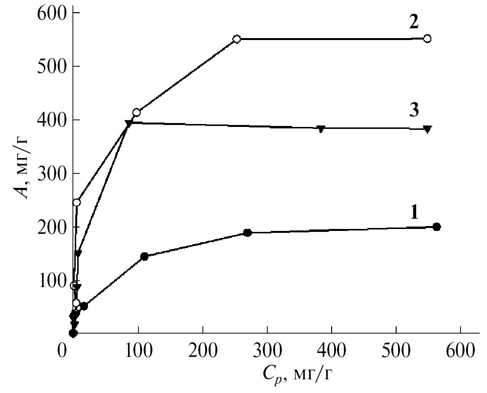 Рис. 5. Изотермы адсорбции свинца образцами 1–3 (нумерация согласно табл. 1).