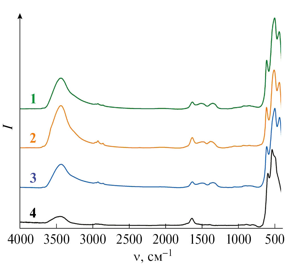 Рис. 7. ИК-Фурье-спектры образцов, полученных в ходе анионообменного осаждения без использования полисахарида (образцы 1–3, табл. 2), и образца 4, полученного после обработки образца 3Д (табл. 1) при 350°C.
