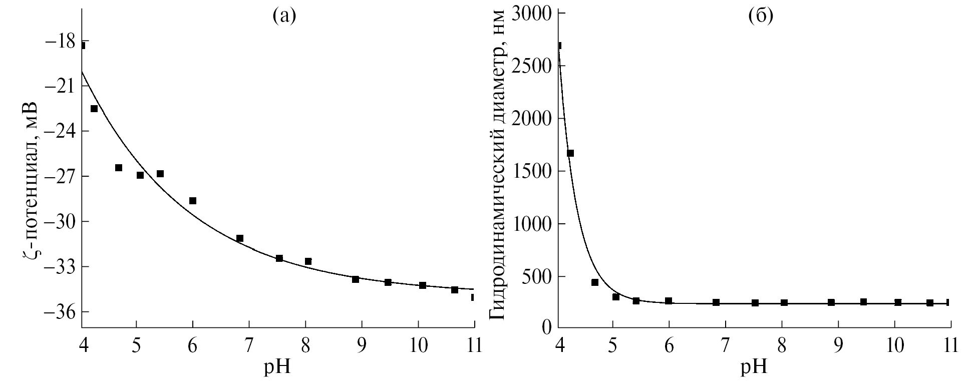 Рис. 8. Зависимости гидродинамического диаметра (a) и ζ-потенциала (б) наночастиц CuO (образец 3, табл. 2), стабилизированных монозамещенным цитратом натрия, от величины pH.