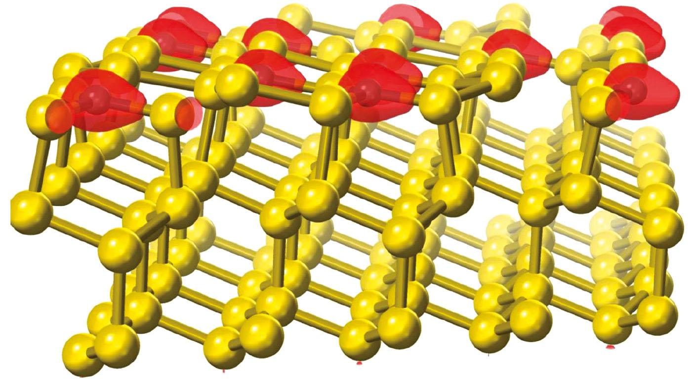 Важную роль в релаксации энергии системы в данном случае играют электрические и магнитные поля. Расчеты методом функционала плотности показывают, что атомы углерода, участвовавшие в замещении, приобретают положительный заряд. На рис. 4 в “предкарбидной” структуре кремния красным цветом выделены зоны положительного заряда с плотностью ~0.6 e/Å3, где e – заряд электрона. Поэтому легирование исходного кремния бором или фосфором может сильно повлиять на распределение электрических полей в зоне реакции замещения и, следовательно, на ориентацию пленки SiC и скорость ее роста [19].
