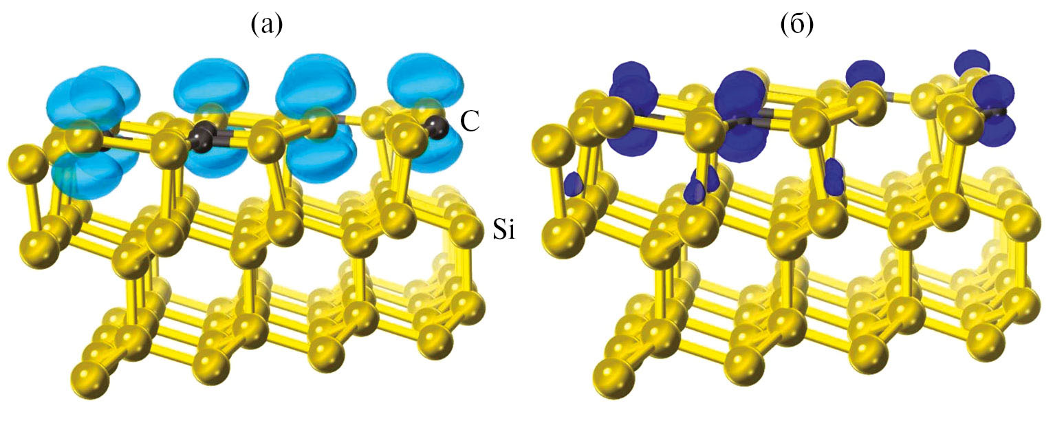 Рис. 5. Разница в плотности электронов со спином вверх и спином вниз в “предкарбидной” структуре кремния. Граница области светло-синего цвета соответствует разности 0.03 e/Å3 (а), граница области темно-синего цвета – разности –0.01 e/Å3 (б).