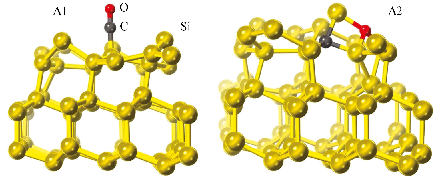 Рис. 7. Адсорбционные состояния A1 и A2 молекул CO и SiO на поверхности (111).