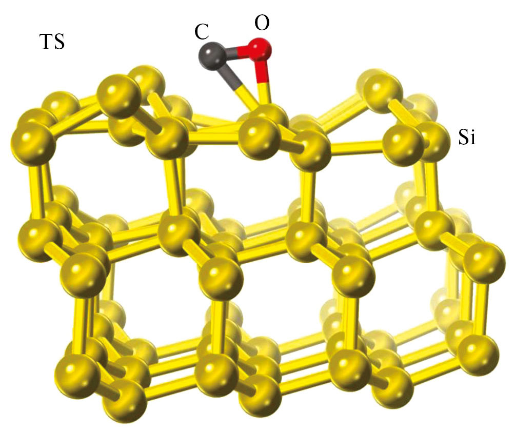 Рассчитан энергетический профиль данного химического превращения. Рассчитаны два промежуточных адсорбционных состояния и единственное переходное состояние. Показано, что оно представляет собой треугольник Si–O–C с длинами связей 1.94 Å (Si–O), 1.24 Å (C–O), 2.29 Å (Si–C). Таким образом, установлено, что поверхность (111) приводит к наиболее качественному росту кристалла SiC-3C.