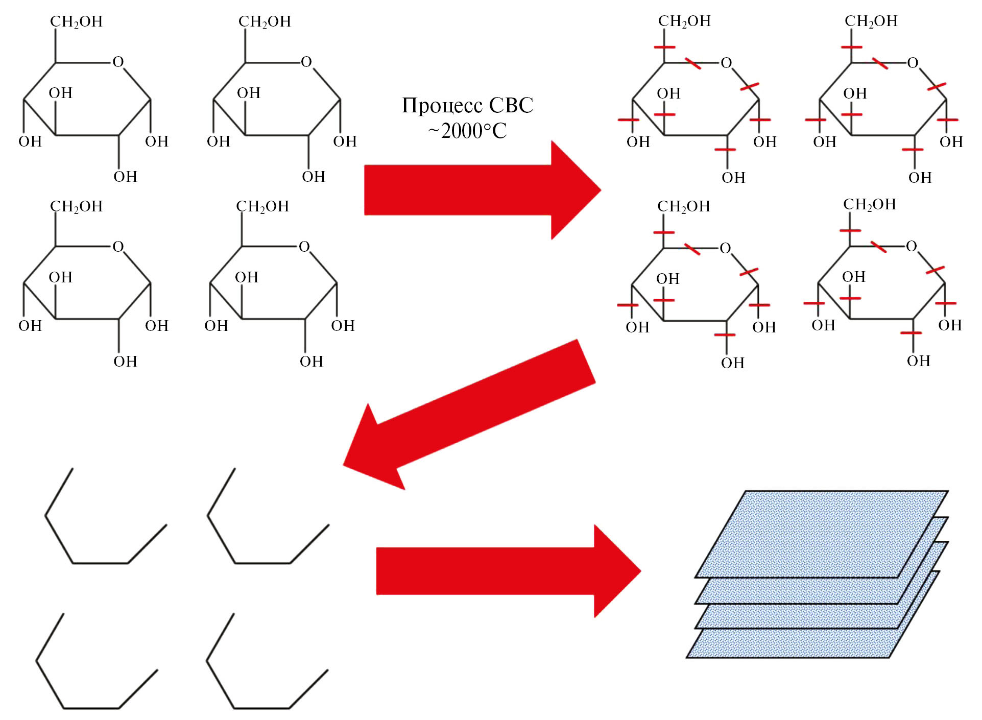 Далее полученный по указанной методике СВС МГ для удобства будет обозначаться как SHSG. Рассмотрим механизм синтеза SHSG в условиях процесса СВС [31]. За счет воздействия высокотемпературной волны, возникающей в результате СВС, происходит деструкция молекул биополимера до углеродных примитивов, в том числе до углеродных гексагонов с раскрытыми связями, с последующей самоорганизацией в графеновые плоскости. На рис. 4 представлена модель синтеза SHSG в условиях СВС из глюкозы.