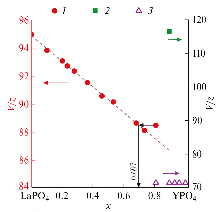 На рис. 2 приведены зависимости объема элементарной ячейки твердых растворов со структурой рабдофана и ксенотима, отнесенного к числу формульных единиц V/z, в зависимости от содержания иттрия в системе LaPO4–YPO4–(H2O). Полученные данные об уменьшении параметров элементарной ячейки рабдофана при увеличении доли иттрия согласуются с правилом Ретгерса [58]. Для образца Y81% полученные значения объема элементарной ячейки рабдофана выпадают из общей зависимости V/z от x. Заметно большие, чем можно было ожидать в соответствии с правилом Ретгерса, значения V/z для данного образца связаны, по-видимому, с появлением в нем фазы со структурой ксенотима, обогащенной YPO4, что приводит к уменьшению доли YPO4 в фазе со структурой рабдофана. Значения параметра V/z фазы со структурой черчита в образце Y90% близки к значениям, характерным для индивидуального соединения YPO4 · 2H2O [37]. По-видимому, фосфат лантана не растворяется в фазе со структурой черчита (YPO4 · 2H2O) и существует в виде аморфной фазы.
