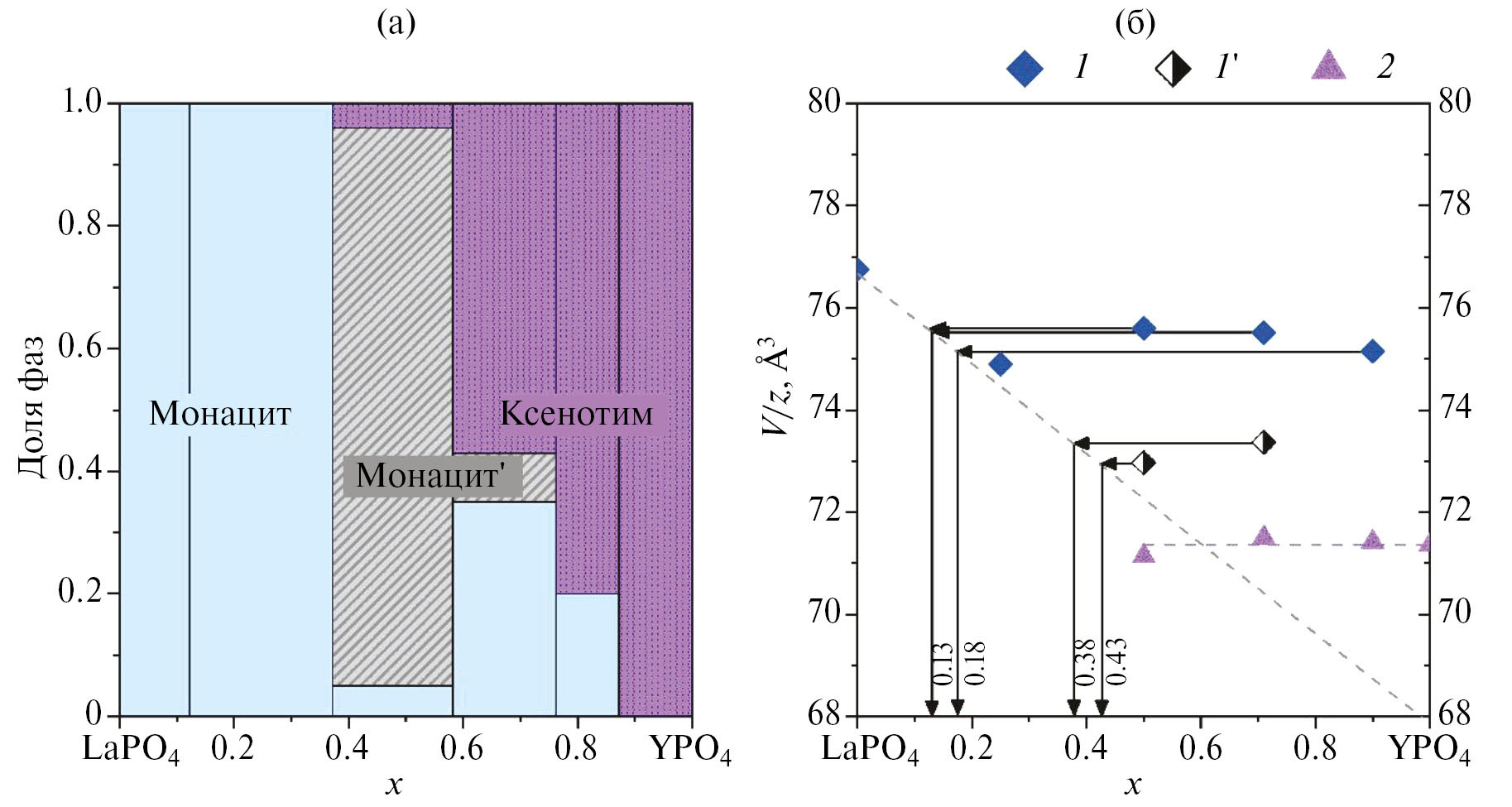 Рис. 4. Соотношение количества фаз в системе LaPO4–YPO4 после отжига при 1200°С в течение 5 сут в зависимости от содержания YPO4 (x, мол. д.) в системе (а) и зависимость объема элементарной ячейки, отнесенного к одной формульной единице структуры (V/z), от содержания YPO4 (x, мол. д.) в системе для структур: 1, 1′ – монацита, 2 – ксенотима (б).