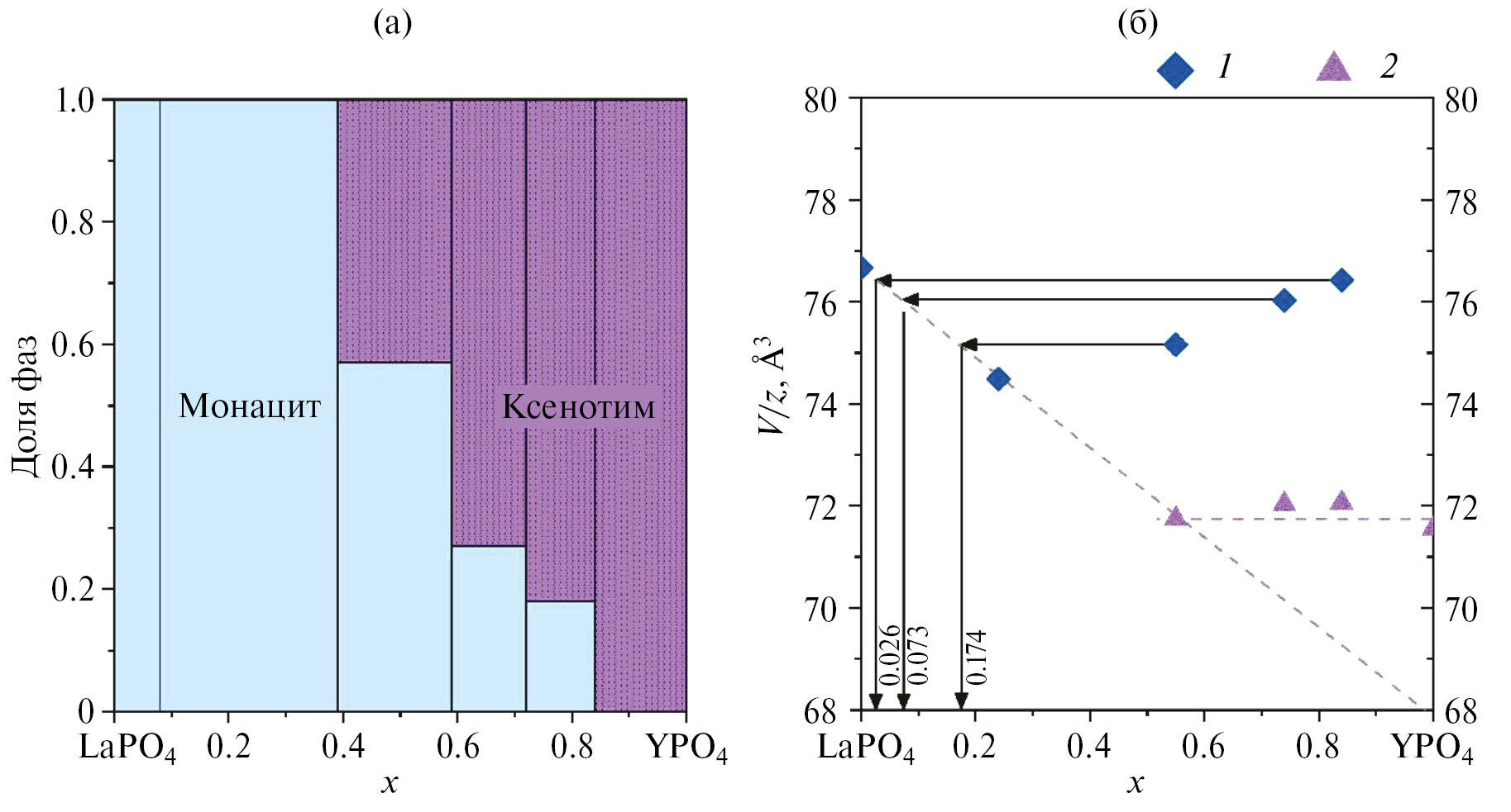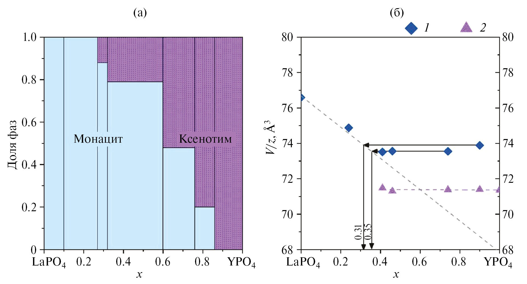 Рис. 6. Соотношение количества фаз в системе LaPO4–YPO4 после отжига при 230°С в течение 28 сут в зависимости от содержания YPO4 (x, мол. д.) в системе (а) и зависимость объема элементарной ячейки, отнесенного к одной формульной единице структуры (V/z), от содержания YPO4 (x, мол. д.) в системе для структур: 1 – монацита, 2 – ксенотима (б).