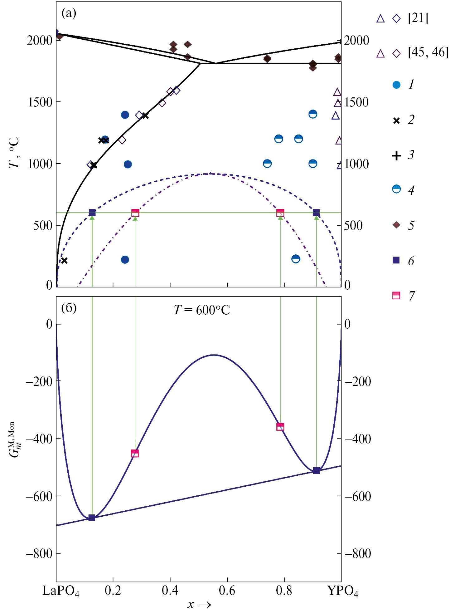 Рис. 7. (a) Диаграмма состояния системы LaPO4–YPO4. Сплошная кривая – термодинамически оптимизированная диаграмма фазовых равновесий, пунктирная кривая – метастабильная бинодаль – гипотетическое расслаивание фазы со структурой монацита, точка-пунктирная кривая – спинодальный распад фазы со структурой монацита. Экспериментальные данные: 1 – однофазный состав со структурой монацита, 2 – равновесный состав на основе фазы со структурой монацита, 3 – равновесный состав со структурой ксенотима, 4 – валовый состав образцов в двухфазной области, 5 – температура начала плавления твердой фазы, определенная методом ВПА. Расчетные данные: 6 – точки метастабильной бинодали для фазы со структурой монацита при 600°C, 7 – точки спинодального распада для фазы со структурой монацита при T = 600°C. (б) Кривая мольной энергии Гиббса смешения фазы со структурой монацита с общей касательной к кривой: x – мол. д. YPO4, GmM,Mon – мольная энергия смешения Гиббса фазы со структурой монацита (субрегулярная модель), Дж/моль.