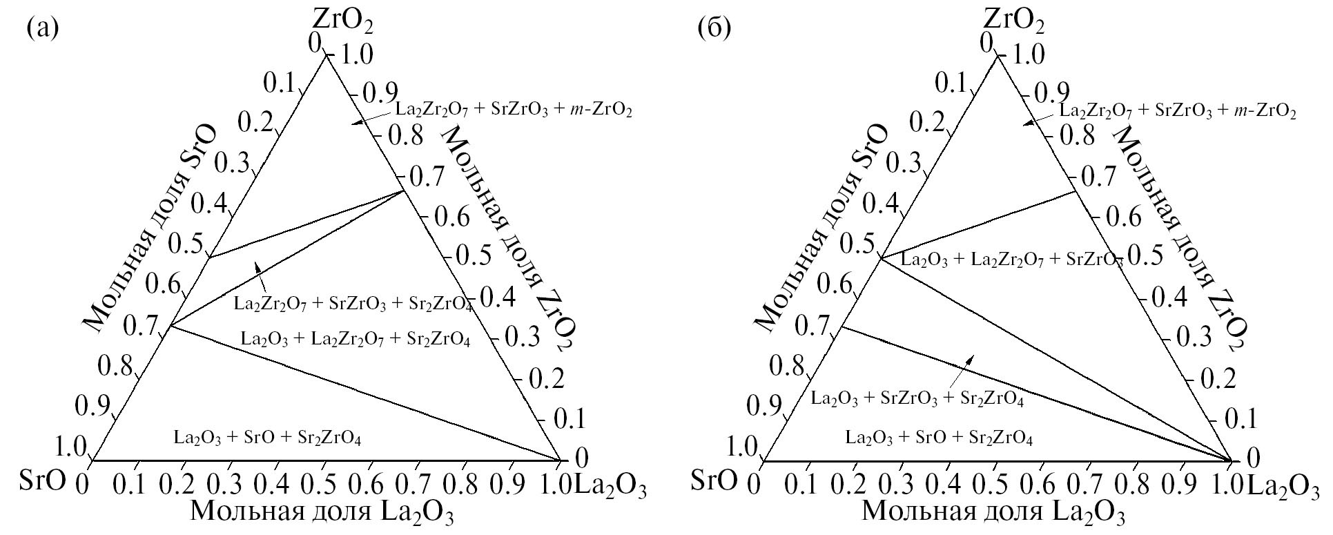 Рис. 4. Изотермические сечения фазовой диаграммы системы La2O3–SrO–ZrO2, рассчитанные в настоящей работе с использованием базы данных NUCLEA [25] до температуры 646 K (а), при температуре 647 K (б).