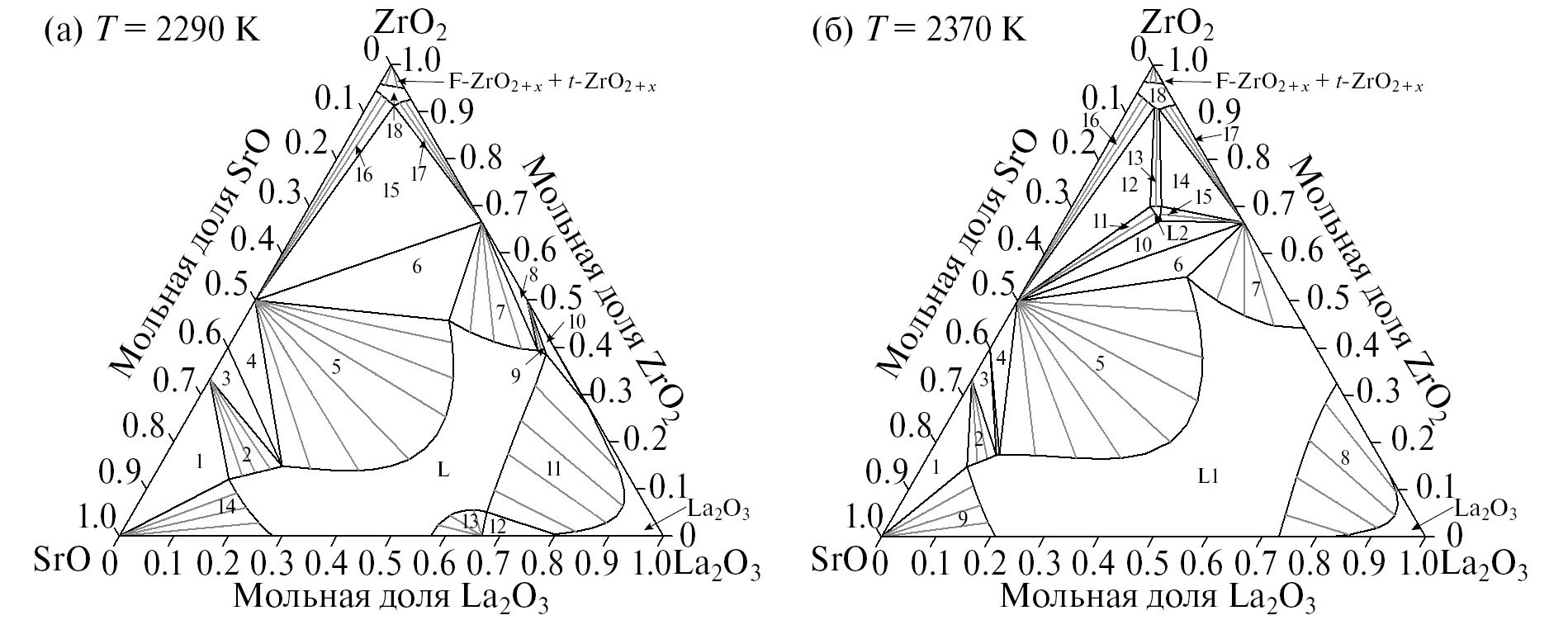 Рис. 8. Изотермические сечения фазовой диаграммы системы La2O3–SrO–ZrO2, рассчитанные в настоящей работе с использованием базы данных NUCLEA [25] при температуре 2290 K (а): 1 – L + SrO + Sr2ZrO4, 2 – L + Sr2ZrO4, 3 – L + Sr2ZrO4 + Sr3Zr2O7, 4 – L + SrZrO3 + Sr3Zr2O7, 5 – L + SrZrO3, 6 – L + La2Zr2O7 + SrZrO3, 7 – L + La2Zr2O7, 8 – L + La2ZrO5 + La2Zr2O7, 9 – L + La2ZrO5, 10 – L + La2O3 + La2ZrO5, 11 – L + La2O3, 12 – L + La2O3 + La4SrO7, 13 – L + La4SrO7, 14 – L + SrO, 15 – La2Zr2O7 + SrZrO3 + F–ZrO2+x, 16 – SrZrO3 + F–ZrO2+x, 17 – La2Zr2O7 + F–ZrO2+x, 18 – F–ZrO2+x; при температуре 2370 K (б): 1 – L1 + SrO + Sr2ZrO4, 2 – L1 + Sr2ZrO4, 3 – L1 + Sr2ZrO4 + Sr3Zr2O7, 4 – L1 + SrZrO3 + Sr3Zr2O7, 5 – L1 + SrZrO3, 6 – L1 + La2Zr2O7 + SrZrO3, 7 – L1 + La2Zr2O7, 8 – L1 + La2O3, 9 – L1 + SrO, 10 – L2 + La2Zr2O7 + SrZrO3, 11 – L2 + SrZrO3, 12 – L2 + SrZrO3 + F–ZrO2+x, 13 – L2 + F–ZrO2+x, 14 – L2 + La2Zr2O7 + F–ZrO2+x, 15 – L2 + La2Zr2O7, 16 – SrZrO3 + F–ZrO2+x, 17 – La2Zr2O7 + F–ZrO2+x, 18 – F–ZrO2+x. Серые линии соответствуют нодам, соединяющим составы сосуществующих фаз в двухфазных равновесиях.