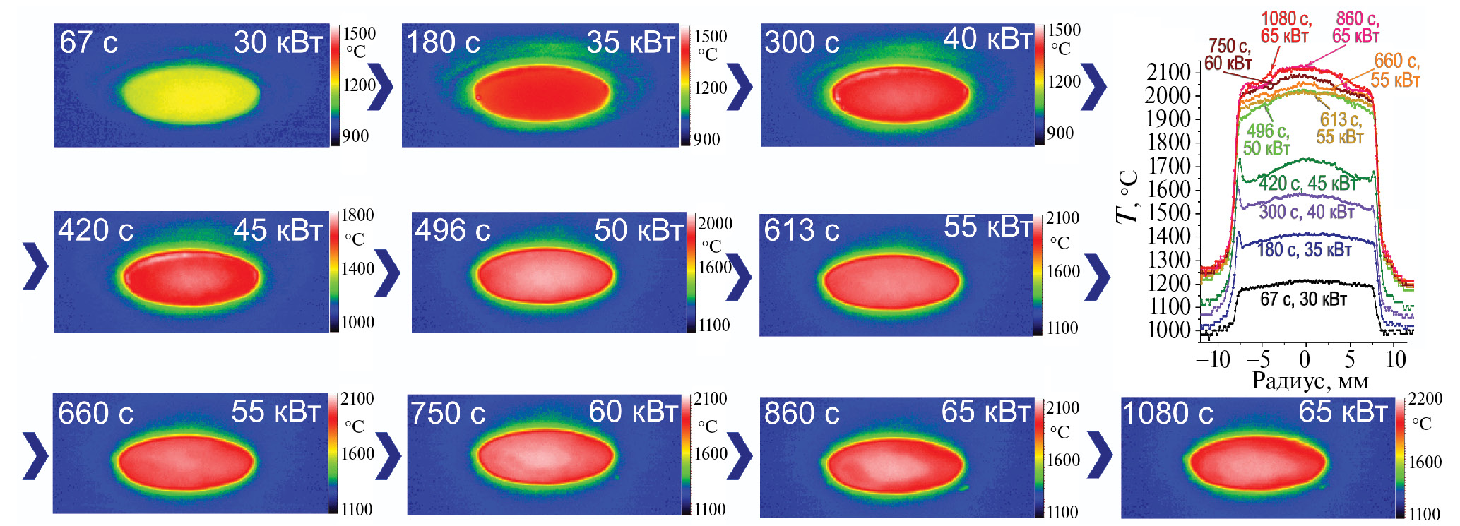 Анализ регистрируемых непосредственно в ходе нагрева термоизображений поверхности (рис. 2) показал, что после ввода в струю азотной плазмы распределение температуры на поверхности образца является достаточно равномерным, в конкретный момент времени (67 с воздействия) перепад температур составлял от 1170 до 1215°С. Уже на следующих ступенях увеличения мощности можно отметить некоторое повышение температуры на краю образца на 70–95°С для N = 35–45 кВт соответственно, которое исчезает после “скачка температур” и может быть вызвано, вероятно, краевыми эффектами. Следует отметить, что по мере возрастания мощности наблюдается все больший перепад между температурами центральной части и периферии образца, который несколько выравнивается после эффекта резкого роста температуры до 2000–2100°C. На финальных минутах воздействия (при N = 55–65 кВт) на кривых изменения температуры по диаметру образца (рис. 2) можно выделить центральную область (диаметром 8–9 мм) с незначительно повышенной температурой. Кроме того, анимация термоизображений, полученных в ходе воздействия, позволяет зафиксировать некоторое волнообразное изменение, своеобразную пульсацию температуры, которая может быть вызвана циклической химической модификацией поверхности и абляцией образовавшегося продукта высокоскоростным газовым потоком.