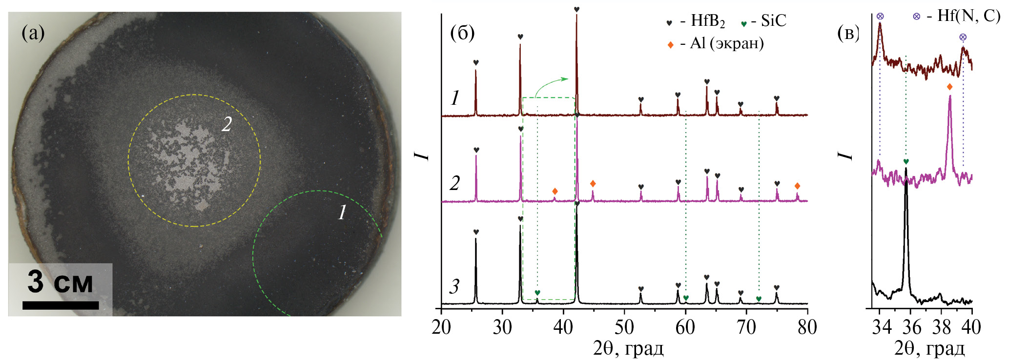 Рис. 3. Внешний вид лицевой поверхности образца HfB2–SiC–C(графен) после воздействия сверхзвукового потока диссоциированного азота (a) и рентгенограммы (б) отмеченных участков (1) и (2), а также исходной керамики (3); участок рентгенограммы в интервале 2q = 34°–40° (в).