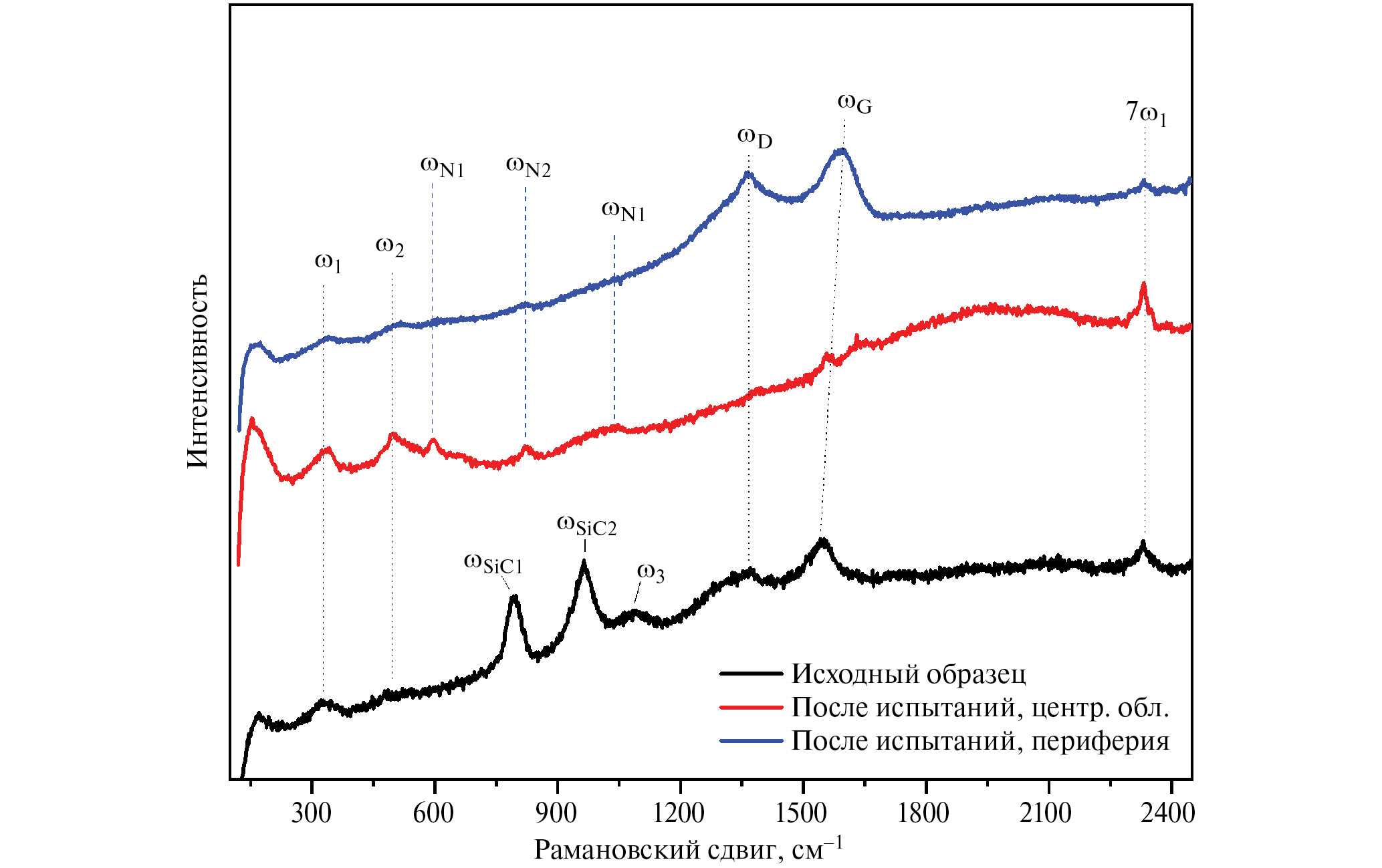 На рис. 4 представлены Раман-спектры исходного образца и его трансформировавшейся под воздействием N2-плазмы поверхности в центральной области и на периферии. В спектре для исходного материала HfB2–SiC–C(графен) присутствуют две интенсивные моды ωSiC1 и ωSiC2 при 794 и 964 см–1 (ТО и LO), относящиеся к фазе карбида кремния (вероятнее всего, политип 3С) [68, 69], а уширенные моды средней интенсивности ωD и ωG с максимумами при ⁓1370 и 1547 см–1, которые хорошо соотносятся с характерными полосами различных форм углерода, в данном случае можно отнести к присутствующему в составе материалов восстановленному оксиду графена. Кроме того, можно выделить и существующие четыре малоинтенсивные полосы ω1, ω2, ω3 и 7ω1 при 332, 487, 1083 и 2332 см–1, которые хорошо согласуются с данными для карбида бора [70], который может присутствовать в составе керамики в качестве примесной фазы на границе между зернами HfB2–C и HfB2–SiC. По имеющимся литературным данным [71, 72], HfB2 не проявляет характерных интенсивных мод на Раман-спектрах. Однако запись КР-спектра исходного порошка HfB2 (примесь в котором B4C маловероятна) показала, что наблюдаемые полосы ω1, ω2, ω3 и 7ω1 могут быть отнесены и к этой фазе. Для достижения полной ясности в данном вопросе необходимо выполнить дополнительные спектральные исследования особо чистой фазы HfB2.