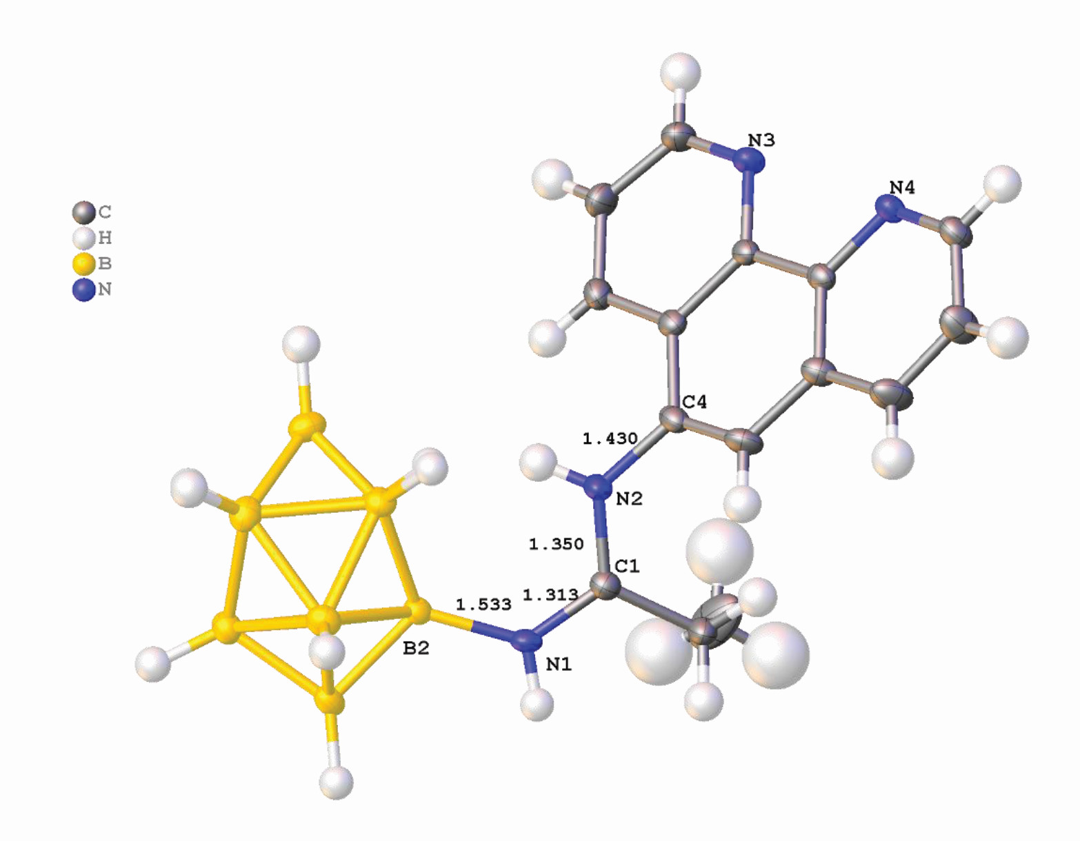ИК-спектр (KBr, см–1): 3315, 3243, 3202 ν(N–H), 2520 ν(B–H), 1625 ν(C=N); 11B ЯМР-спектр (CD3CN, м.д.), δ: 1.2 (д, 1B, B(10), JB–H = 144 Гц), –6.0 (д, 1B, B(1), JB–H = 141), –16.7 (с, 1B, B(2)), –25.8 (д, 4B, B(3, 5, 6, 9), JB–H = 126), –28.9 (д, 3B, B(4, 7, 8), JB–H = 127); 1Н ЯМР-спектр (CD3CN, м.д.), δ: –1.10…1.55 (м, 9Н, В10Н9), 10.20 (уш. с, 1H, NH–C=NH), 9.16 (ддд, 1H, phen, J = 15.6, 4.3, 1.7 Гц), 8.70 (дд, 1H, J = 8.4, 1.6 Гц), 8.38 (дд, 1H, phen, J = 8.2, 1.7 Гц), 7.89 (с, 1H, phen), 7.88–7.85 (м, 1H, phen), 7.73 (дд, 1H, phen, J = 8.1, 4.3 Гц), 7.08 (уш. с, 1H, NH–C=NH), 3.06 (NBu4), 2.17 (c, 3H, CH3), 1.58 (NBu4), 1.33 (NBu4), 0.95 (NBu4); 13C ЯМР-спектр (CD3CN, м.д.), δ: 166.6 (NH=C–NH), 151.6, 147.7, 146.6, 137.3, 132.4, 131.9, 128.8, 127.4, 125.8, 124.7 (phen), 59.3 (NBu4), 24.3 (NBu4), 20.3 (NBu4), 19.4 (NH=C–CH3), 13.8 (NBu4). MS(ESI) m/z: 353.2789 а.е.м. (найдено для C14H21B10N4; вычислено для {[A]–} 355.2697).