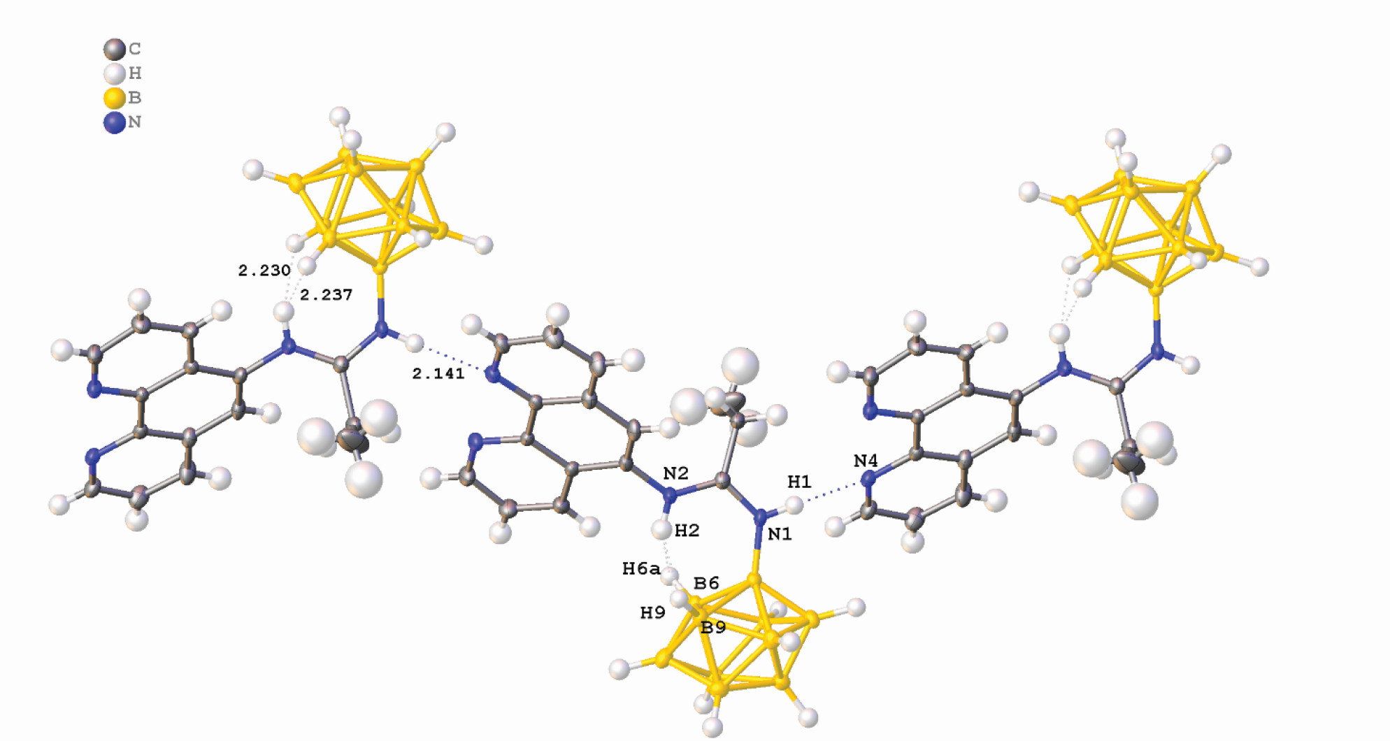 была установлена методом РСА монокристалла. Так, структура состоит из тетрабутиламмониевых катионов и замещенных клозо-декаборатных анионов. В анионе экзополиэдрический заместитель располагается в экваториальном поясе (рис. 2). Длина B(2)–N(1) составляет 1.533 Å, что соответствует ординарной связи. Амидиновый фрагмент плоский, связи углерод–азот имеют промежуточный порядок (длины связей C(1)–N(1) 1.313 Å и C(1)–N(2) 1.350 Å), что указывает на наличие сопряжения в фрагменте. Сам амидиновый фрагмент находится в Z-конфигурации, которая стабилизирована внутримолекулярными диводородными связями N(2)H(2)…H(6A)B(6) и N(2)H(2)…H(9)B(9), длины которых составляют 2.24 и 2.23 Å соответственно (рис. 3). Кроме того, анионы объединяются в полимерные цепочки за счет образования межмолекулярных водородных связей N(1)H(1)…N′(4) (длина 2.14 Å).