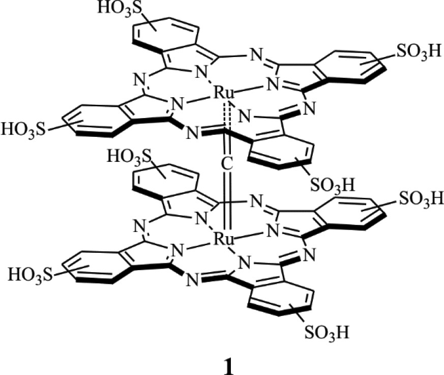 Синтез μ-карбидодимерного тетра-сульфофталоцианината рутения(IV) (1) проводили из несульфированного аналога по известной методике [47]. Комплекс С(RuIVРс)2 (100 мг) растворяли в хлорсульфоновой кислоте и выдерживали при температуре 150°С в течение 5 ч. Конец реакции устанавливали по прекращению изменений в УФ-видимой части ЭСП комплекса. После охлаждения реакционную смесь осторожно выливали на лед и подвергали гидролизу в воде при температуре 80°С. Полученный комплекс очищали методом колоночной хроматографии (Al2O3, H2O). Выход 30%. ЭСП соединения 1 в боратном буфере (λmax, нм (lgε)): 308 (5.35), 607 (5.10). 1H ЯМР-спектр (D2O, вн. ст. ГМДС) δ, м.д.: 8.37s (8H, Pс), 7.41–7.54m (16H, Pс). ИК-спектр (НПВО, боратный буфер) νmax, см–1: 1154, 1047 (S=O, SO3), 1007 (Ru=C=Ru), 947, 925, 864, 726 (S–O, SO3). MALDI TOF: получено m/z 1879.27, для C65H32N16O24Ru2S8 вычислено m/z 1879.77.
