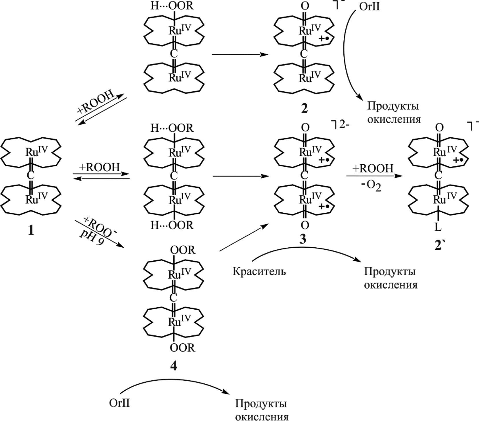 На основании спектральных изменений и кинетических параметров, характеризующих образование и реакционную способность активной частицы в окислении субстратов, можно предположить, что один из вероятных механизмов исследуемого процесса описывается схемой 2. На фоне более высокой реакционной способности активных форм димерного комплекса рутения(IV) по сравнению с радикалами RO• мы не включаем их в данную упрощенную схему.