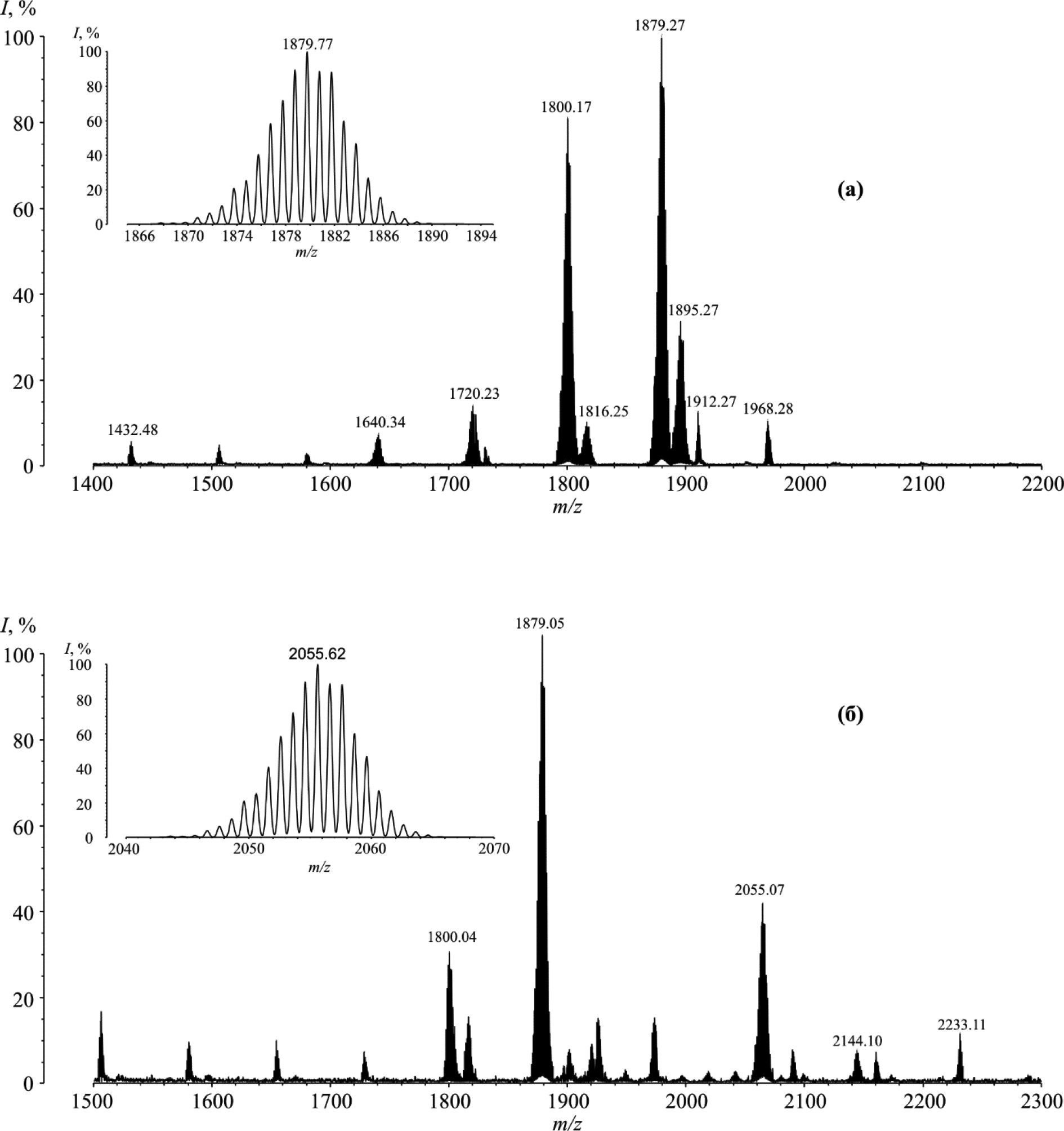 В масс-спекте 1/tBuOOH (СtBuOOH = 6 × 10–2 моль/л) обнаруживается доминирующий сигнал с m/z = 1879.27, относящийся к [1]+. Ионы [1 + О]+, [1 + 2О + Н]+ и [1 + О + OtBu]+ демонстрируют характерные пики при m/z = 1895.27 (теоретически рассчитанная масса 1895.76), 1912.27 (1912.76) и 1968.28 (1968.83) соответственно. Вследствие фрагментации в масс-спектре наблюдаются сигналы с m/z = 1800.17 (1799.81), 1720.23 (1719.85), 1640.34 (1639.90), соответствующие ионам [1-SO3]+ , [1-2SO3]+ , [1-3SO3]+ (рис. 3а). Отрыв сульфогруппы может наблюдаться в результате диссоциативной ионизации. Точная молекулярная масса и картина распределения изотопов [1]+ идентичны теоретически предсказанным для комплекса 1. Анализ масс-спектров позволяет сделать вывод о том, что в реакционной смеси существует оксоформа. Присутствие иона [1 + О + OtBu]+ может свидетельствовать о восстановлении одного из катион-радикальных фталоцианиновых звеньев при окислении трет-бутилгидропероксида дикатионом или соответствовать донорно-акцепторному пероксокомплексу.
