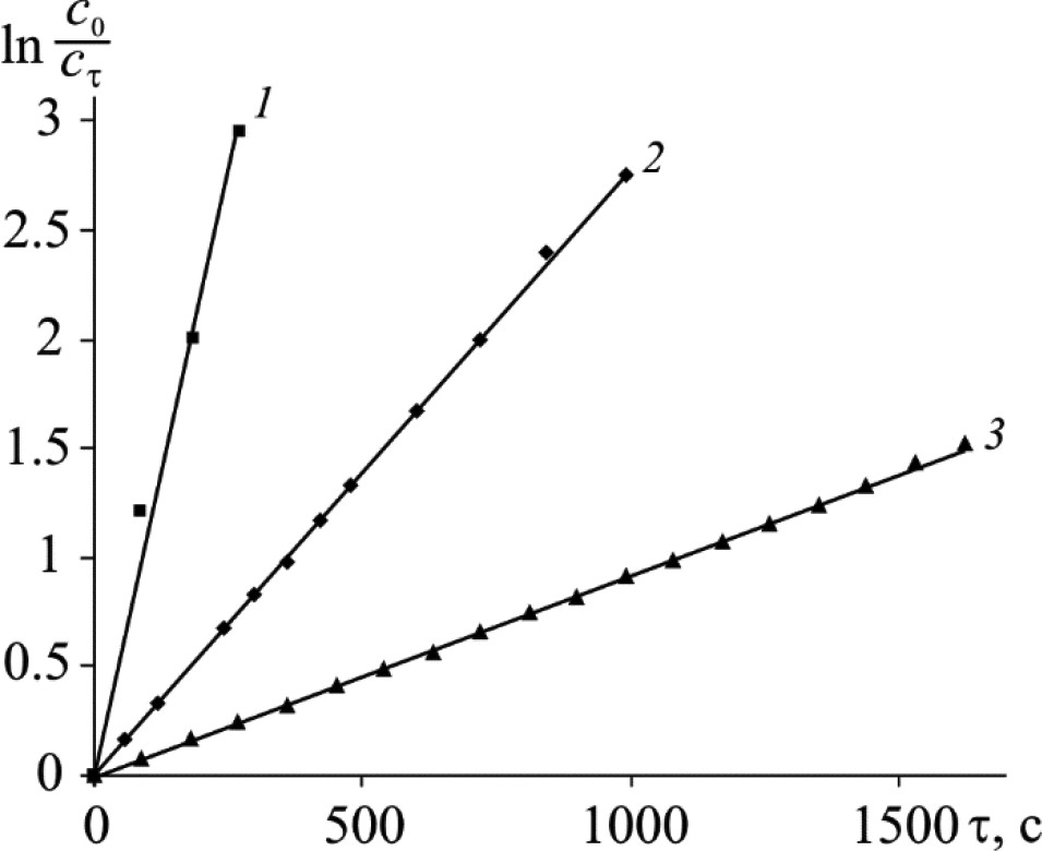 Рис. 7. Зависимость ln(C0/Cτ) от времени (τ) для реакции окисления OrangeII на полосе при λ = 485 нм: 1 – с формой 4, 2 – с формой 3, 3 – с формой 2.