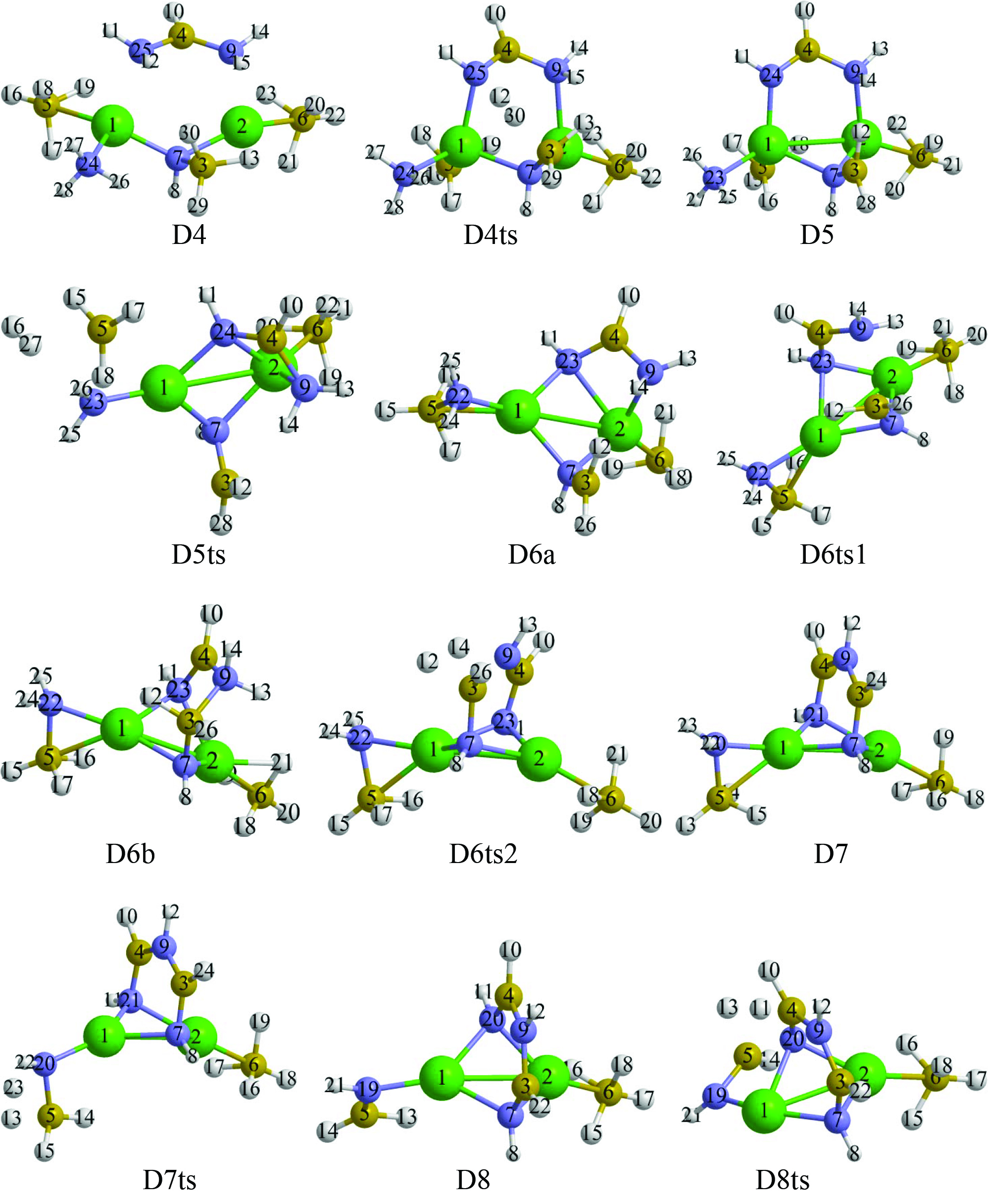 Структура D4 сравнительно легко отдает Н2, объединяя атомы Hδ+ и Hδ‒(H12–H30) из фрагментов HB(NH2)2 и HN‒ (конфигурация D4ts, рис. 2, 3). В D5 объединяются атомы Н из и NH3, и барьер в этом случае оказывается более высоким (D5ts). Для отрыва Н2 от D6a без больших затрат энергии необходимо сблизить фрагменты H2B3–N7H‒и H2N9–B4H–N23H–, преобразовав конфигурацию в D6b (через D6ts1), в которой через D6ts2 от этих фрагментов отделяется Н2, формируя структуру D7 с двукратно заряженным анионом (HB)2(NH). В D7 Н2 отщепляется от аниона H3B5‒N20H2‒ (D7ts) с переходом в D8, а в этой структуре при отрыве Н2 объединяются атомы Н11 и H13 из фрагментов (HB)2(NH) и H2B‒NH‒ (через D8ts). Согласно полученным результатам, вплоть до D8 барьеры на пути отрыва Н2 имели тенденцию к снижению, энергии Гиббса были отрицательными и тоже понижались.