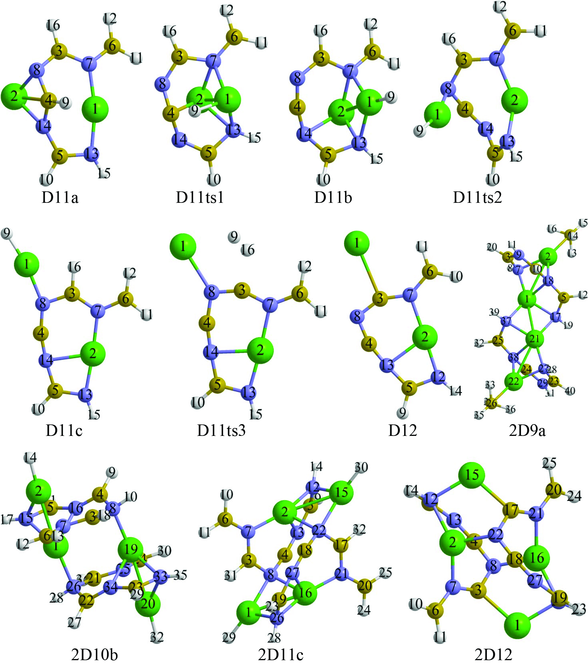 При обсуждении трансформации структур при отщеплении Н2 номера атомов, наиболее существенно участвующих в перестройке, указаны на рисунках в виде верхнего индекса.