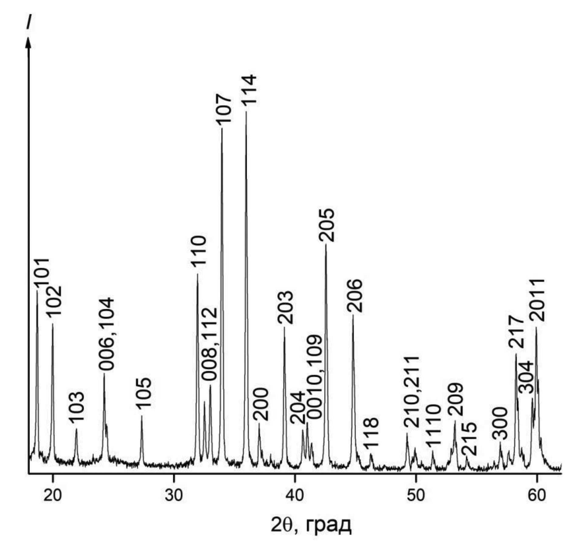Идентификацию образца проводили методами рентгенофазового анализа, растровой электронной микроскопии и элементным анализом. Структура синтезированного образца и отсутствие в нем примесных фаз определены с помощью рентгеновского дифрактометра Bruker D8 Advance (CuKα, λ = 1.5418 Å, Ni-фильтр, детектор Lynxeye, геометрия на отражение) в интервале углов 2θ = 10°–80°. Результаты исследования обрабатывали программой BrukerEVA с использованием базы данных ICDD PDF-2. Кристаллографические параметры были рассчитаны методом полнопрофильного анализа с помощью программного обеспечения TOPAS 4.2.