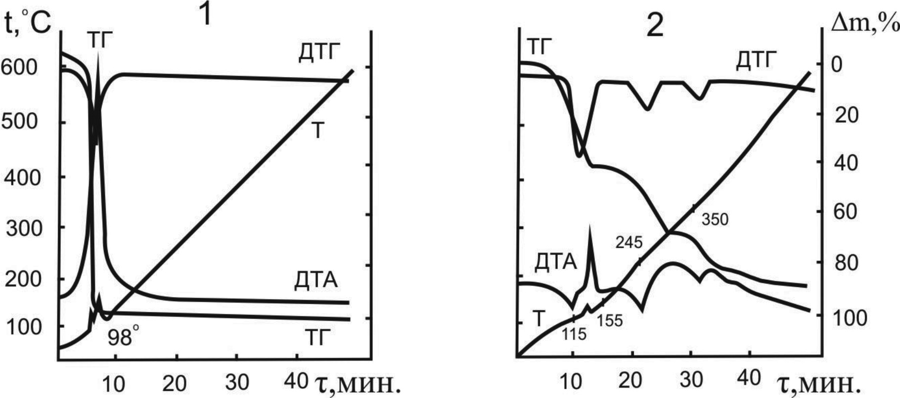Рис. 3. Дериватограмма соединения NH4ClO3 (1), NH4ClO3 · ClCH2CH2HPO3NH4 (2).