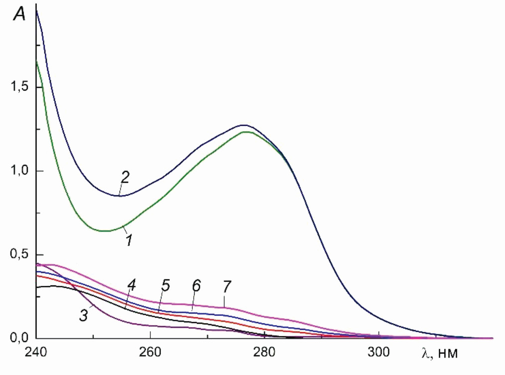 Рис. 4. Изменения УФ-спектров при взаимодействии AuCl(PPh3) с BSA (1%) в AN (37%) в присутствии Cys (2.0 × 10–4 M). 1 – 1% BSA; 2 – 1% BSA + 1.0 × 10–4 M AuCl(PPh3) τ = 0; 3 – 1.0 × 10–4 M AuCl(PPh3) без BSA; 4–7 – разностные спектры A2–A1 для τ (мин) после смешения: 0 (4), 10 (5), 30 (6), 60 (7), l = 0.2 см.
