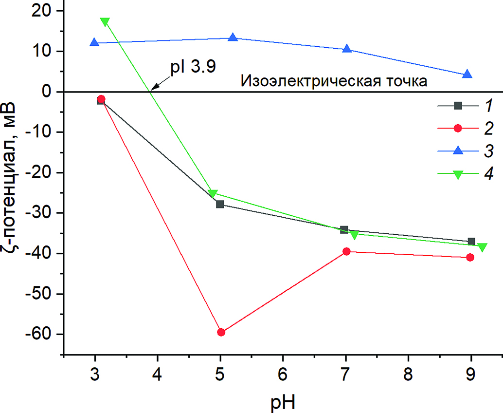 Рис. 1. ζ-Потенциал мембран в зависимости от pH электролита: 1 – ТМ; 2 – ТМ/HNO3; 3 – ТМ/ПЭИ; 4 – ТМ + Хитозан.