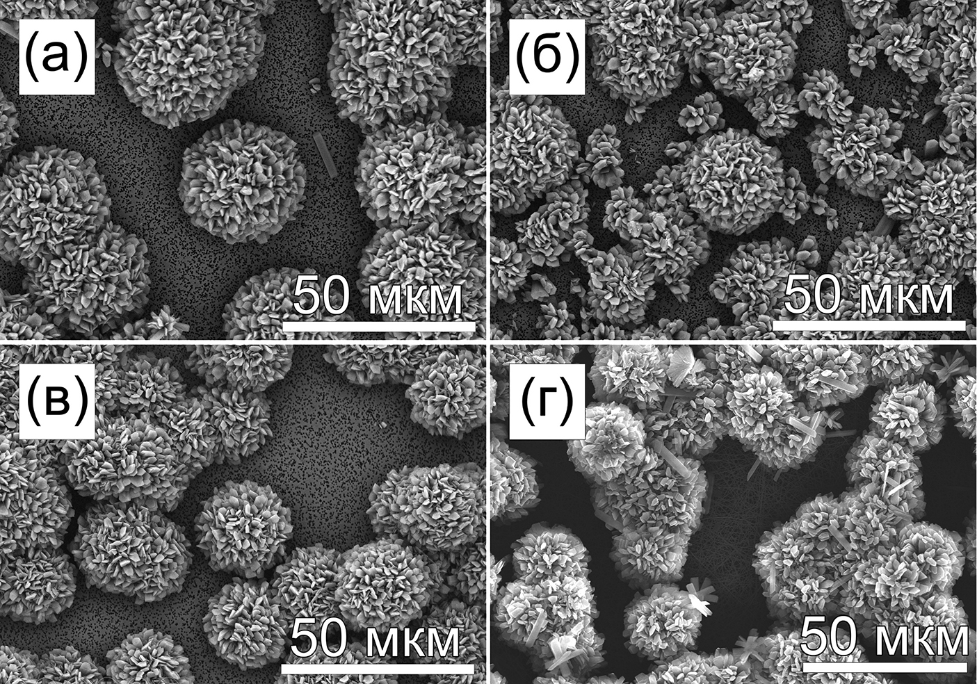 Следующим этапом являлся синтез Ni-МОКС на описанных выше носителях. Из анализа микрофотографий (рис. 2) можно сделать вывод, что на поверхности всех носителей происходит самосборка сферических конгломератов Ni-МОКС, средний диаметр которых составляет 20–25 мкм для разных образцов. Таким образом, модифицирование поверхности ТМ не оказывает значительного влияния на морфологию Ni-МОКС. Происходит объемное осаждение соединения, после чего частицы Ni-МОКС объединяются в конгломераты на поверхности носителя.